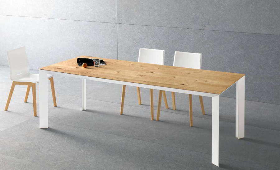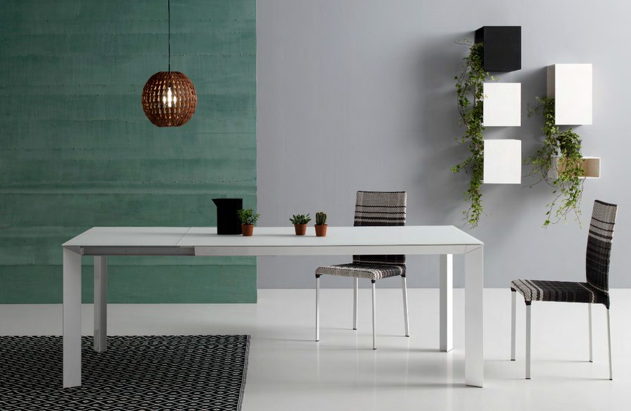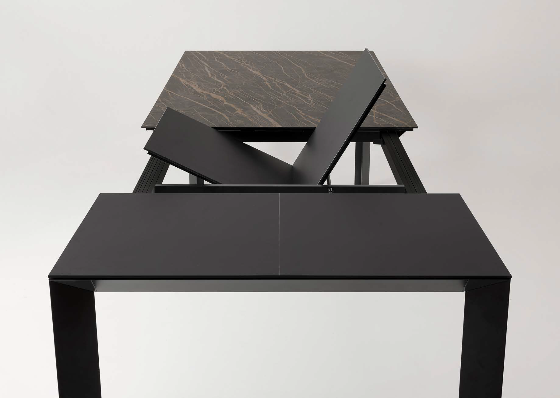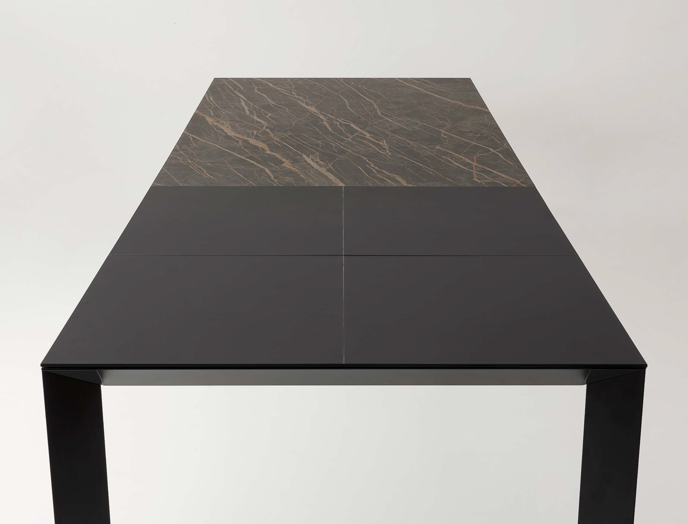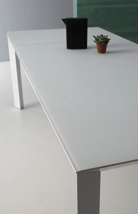 La table extensible Diamante de Point House a une structure en aluminium anodisé ou peint. Le mécanisme d'extension est monté sur le périmètre sur des guides à billes en aluminium, l'extension est du même matériau et de la même finition que le plateau. La particularité de la table est représentée par les coins ou plutôt par les joints d'angle qui constituent un véritable raffinement et sont en aluminium moulé sous pression avec une finition peinte assortie à la structure, à l'exception de la structure en aluminium anodisé où les coins ont une finition chromée polie. Le design de la table Diamante de Point est linéaire et s'adapte bien aux espaces de la maison.