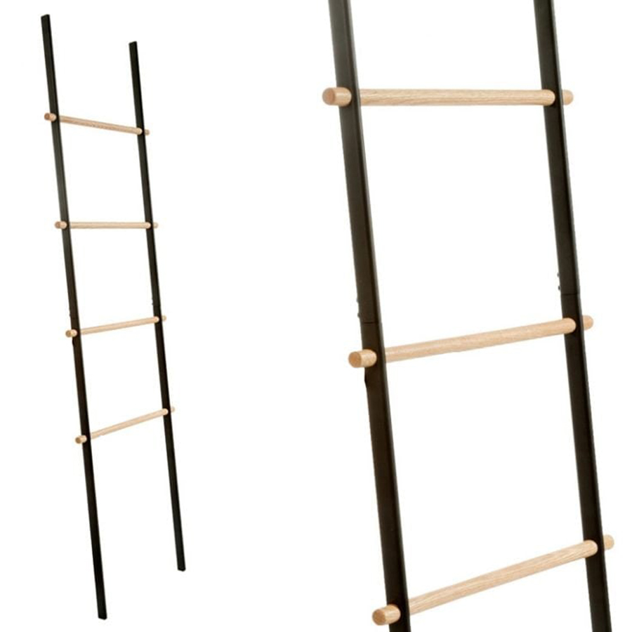 Porte-serviettes/revues échelle en métal satiné et bois naturel. Equipé de patins en caoutchouc antidérapants, il ne nécessite pas de fixations murales. Le kit de montage pratique comprend des vis, une clé Allen et des instructions. Disponible en noir et blanc