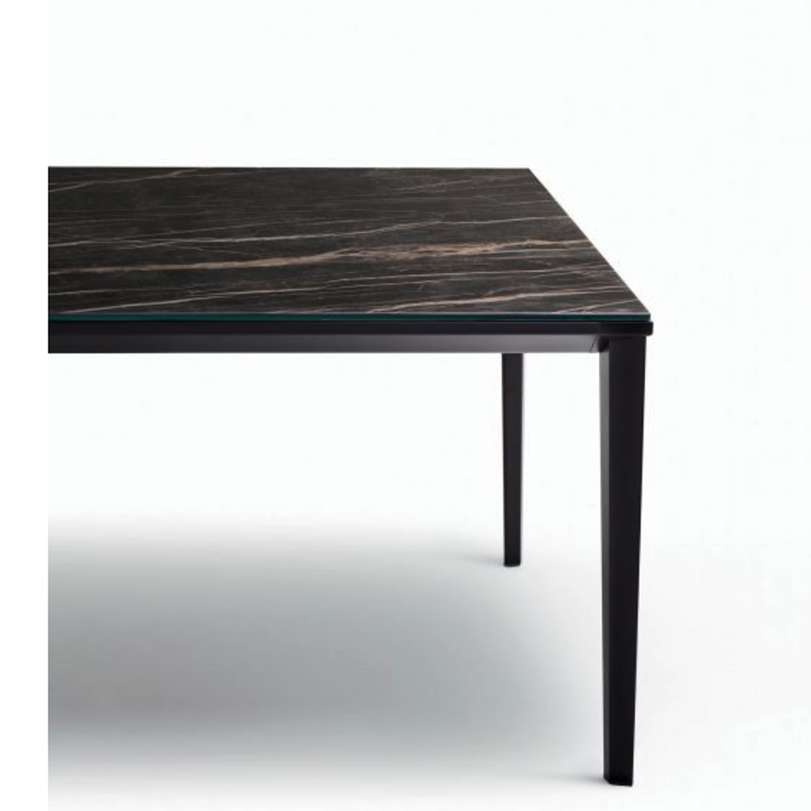 Table Echo de Bontempi. Sa structure est en aluminium et acier laqué, et son plateau ainsi que sa rallonge sont disponibles en verre, en céramique ou en marbre. Avec ses lignes épurées, légères et élégantes, la table Echo s'intègre aussi bien dans la cuisine que dans le salon.