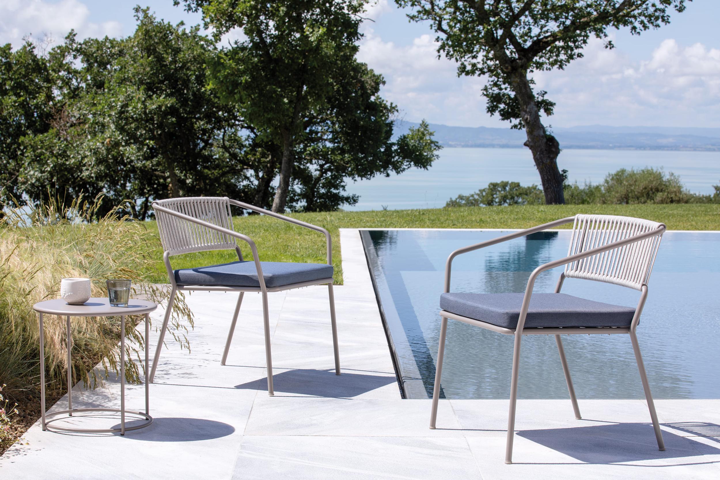 Le fauteuil bas Slot de Vermobil est fabriqué en fer galvanisé, disponible en différentes finitions et cordes, et est livré avec un coussin moelleux.