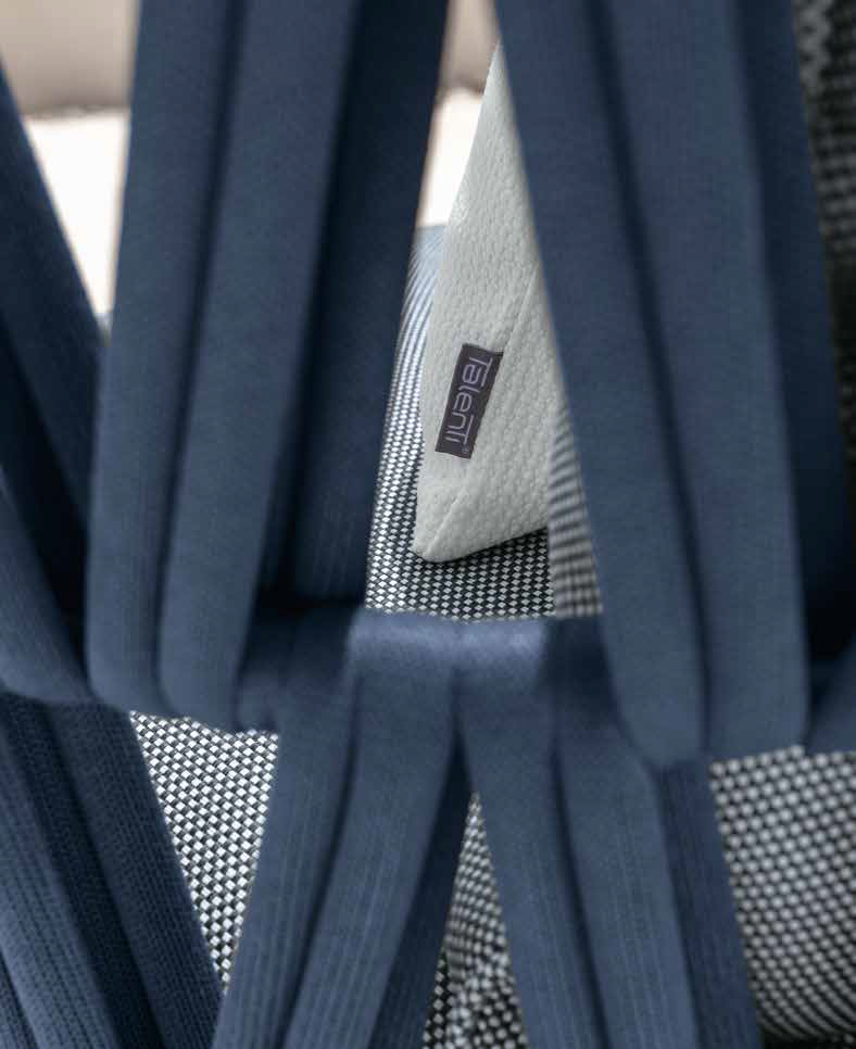 Le fauteuil Swipe, disponible en version fixe ou pivotante, possède une structure en aluminium thermolaqué proposée en plusieurs coloris. Le dossier est recouvert de corde tressée. Les coussins, amovibles, lavables et résistants aux intempéries, sont disponibles en plusieurs couleurs. Le rembourrage est en mousse à séchage rapide.