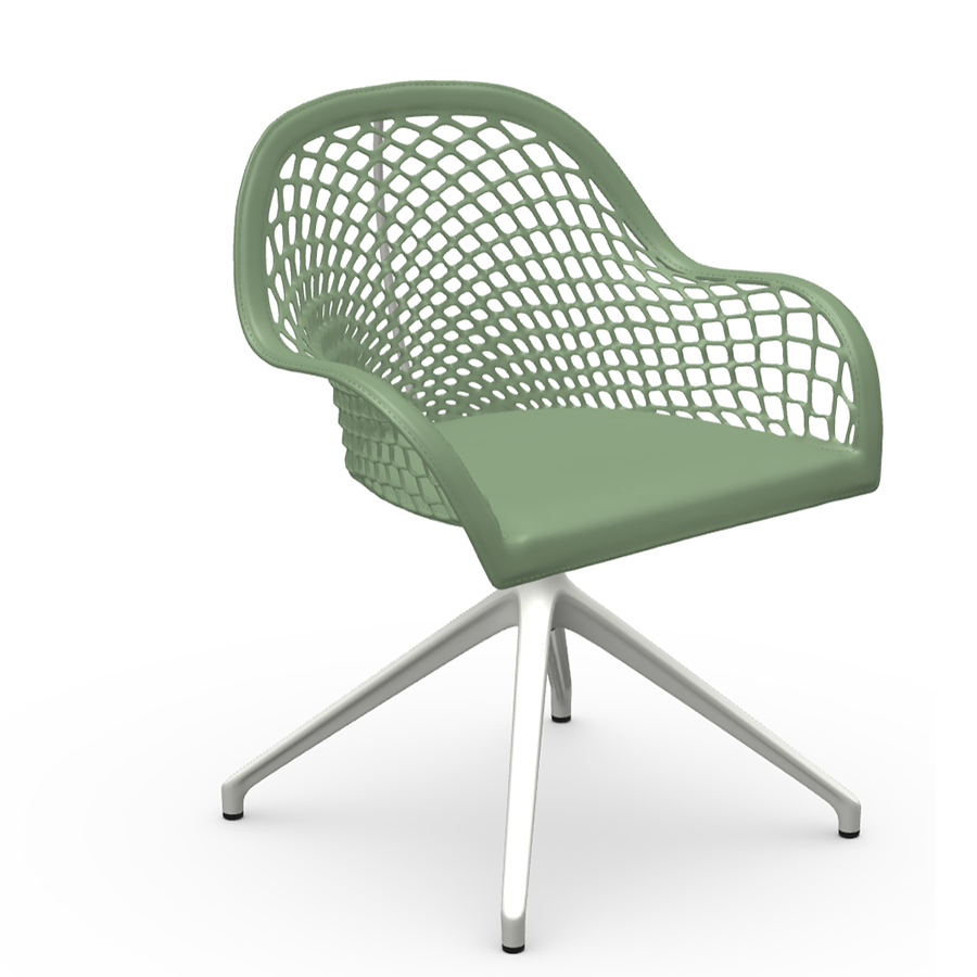 Fauteuil pivotant Guapa avec piètement à tréteaux quatre branches en acier peint. Coque en cuir.