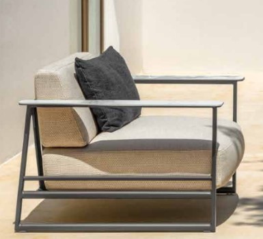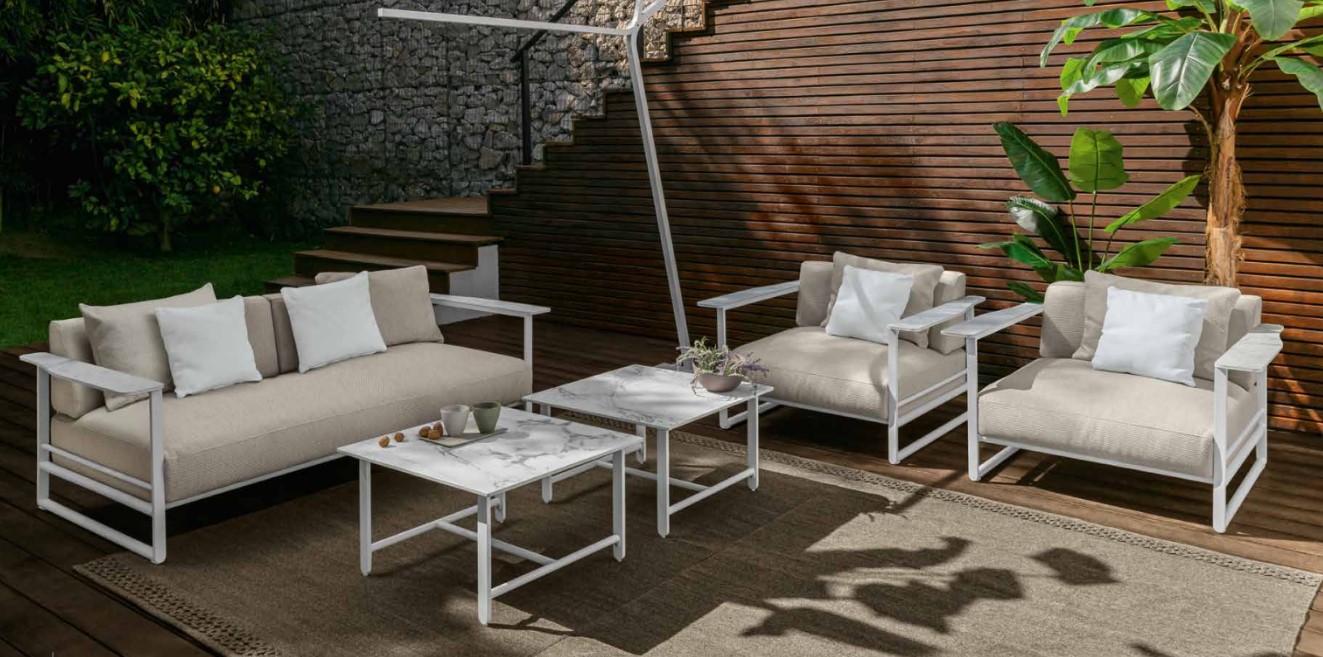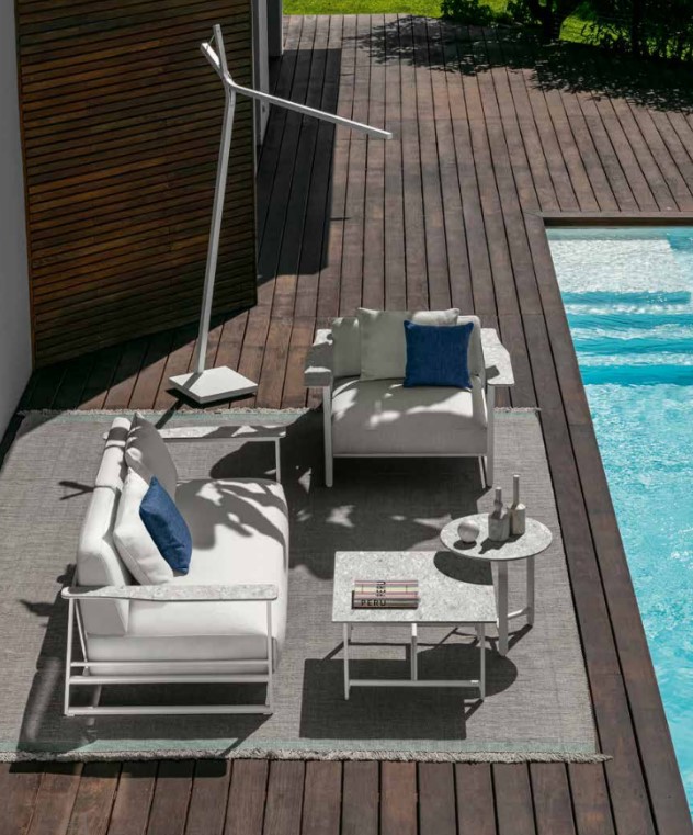 Le fauteuil Riviera de Living, avec son assise profonde et généreuse, est idéal pour se détendre. Son élégante structure en aluminium léger permet d'accueillir de généreux coussins, sublimés par la riche texture des fils sélectionnés. Les accoudoirs en grès cérame rehaussent le produit et apportent une touche de raffinement supplémentaire à l'ensemble, faisant de ce fauteuil un complément parfait pour votre espace extérieur.