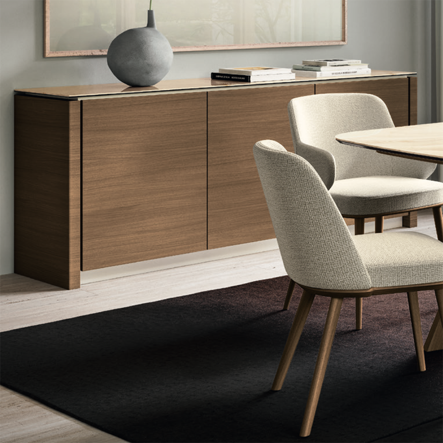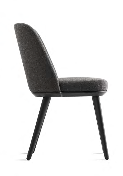 Cela est dû à la coque enveloppante et rembourrée en contreplaqué courbé et à la structure souple de l'assise avec sangles élastiques, soutenue par la base en bois raffinée à quatre pieds fuselés, réalisée dans des nuances qui se marient bien avec la finition de la coque.