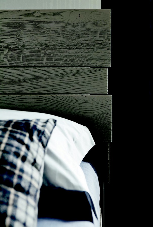 Lit double Kenzo d'Altacorte avec structure en bois de chêne massif en plusieurs finitions et couleurs. Tête de lit caractérisée par des planches de bois horizontales, de différentes longueurs et largeurs. Disponible en deux versions : avec cadre de lit ou avec conteneur.