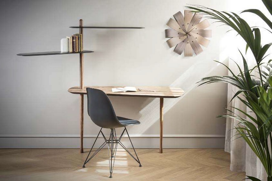 Horloge Ciclo de Nomon en bois plaqué noyer ou chêne. Les plis subtils créent des formes tridimensionnelles qui évoquent la nature. Aiguilles en noyer naturel ou en chêne.