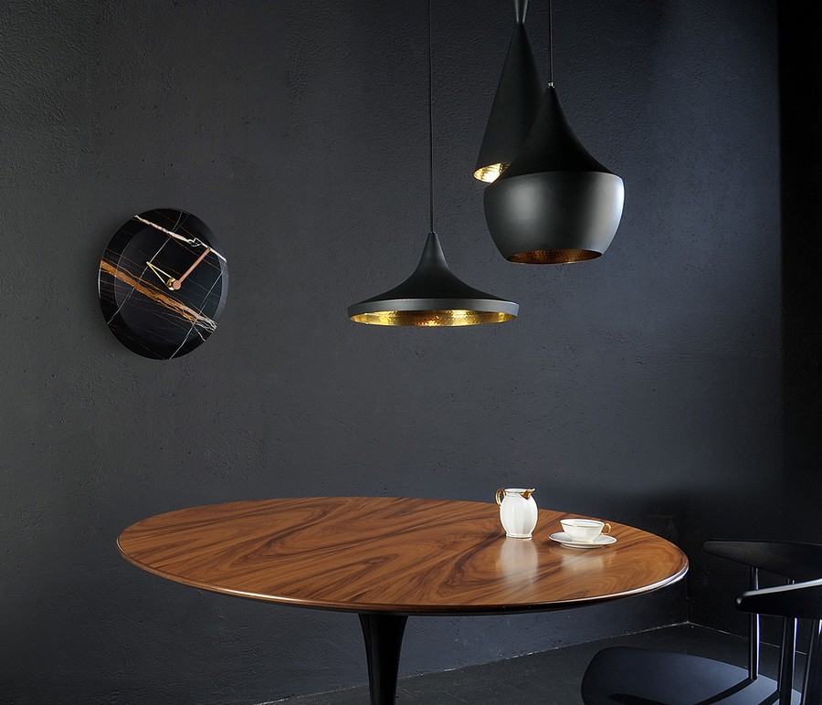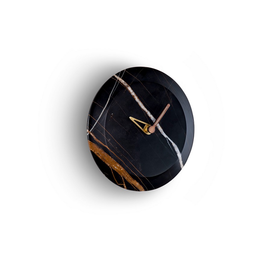 Horloge Bari S de Nomon qui combine une plaque frontale en marbre avec des aiguilles en laiton poli et du noyer naturel. La rotation en bois éloigne l'horloge du mur, créant un jeu visuel qui simule la lévitation de l'objet pour obtenir le contraste parfait entre force et légèreté.