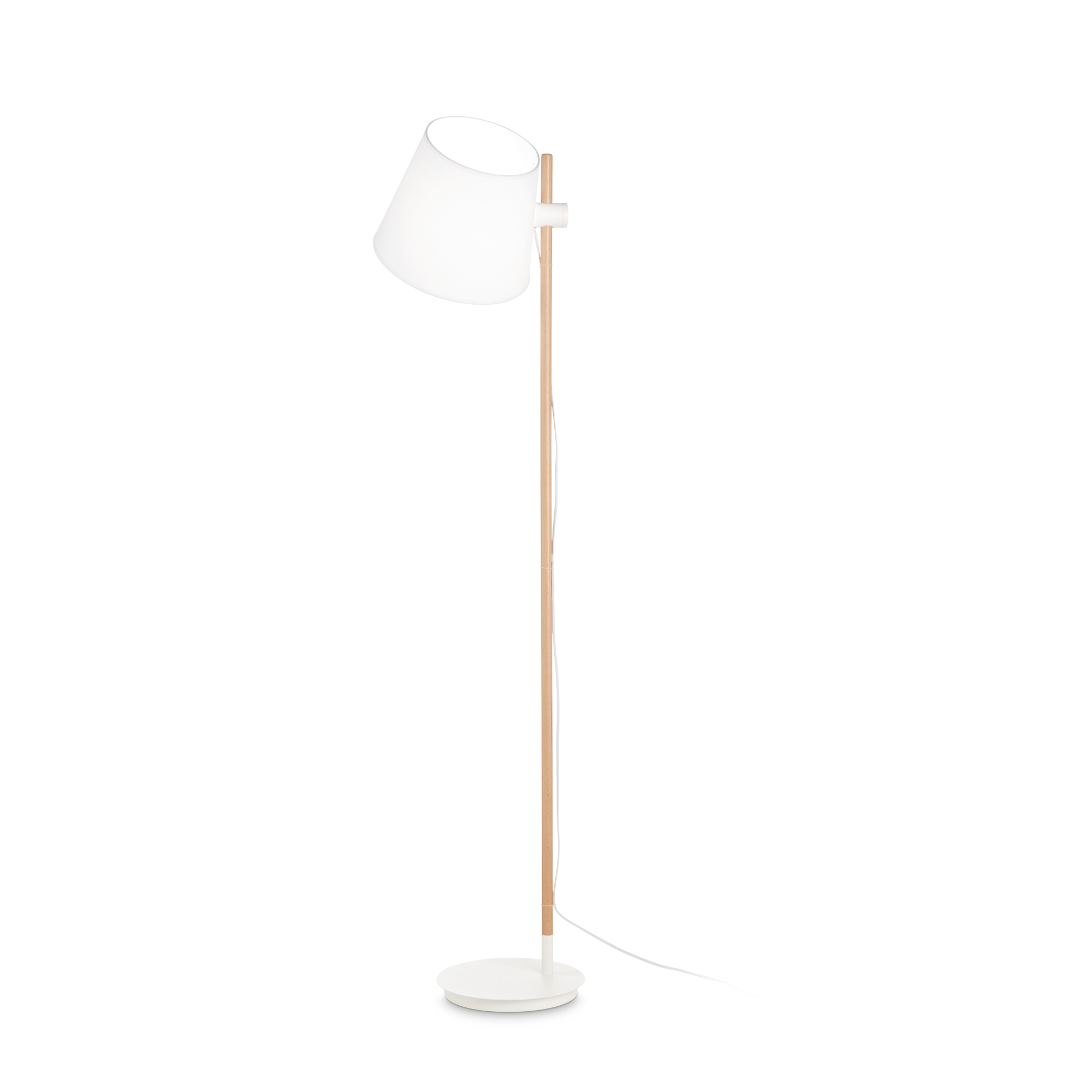 Lampadaire blanc AXEL PT1 d'Ideal Lux avec base et garnitures en métal thermolaqué. Tige en bois naturel. Abat-jour réglable en hauteur, en PVC recouvert de tissu. Câble PVC avec interrupteur. Couleurs : blanc. Lampe avec interrupteur intégré. Ampoule exclue.