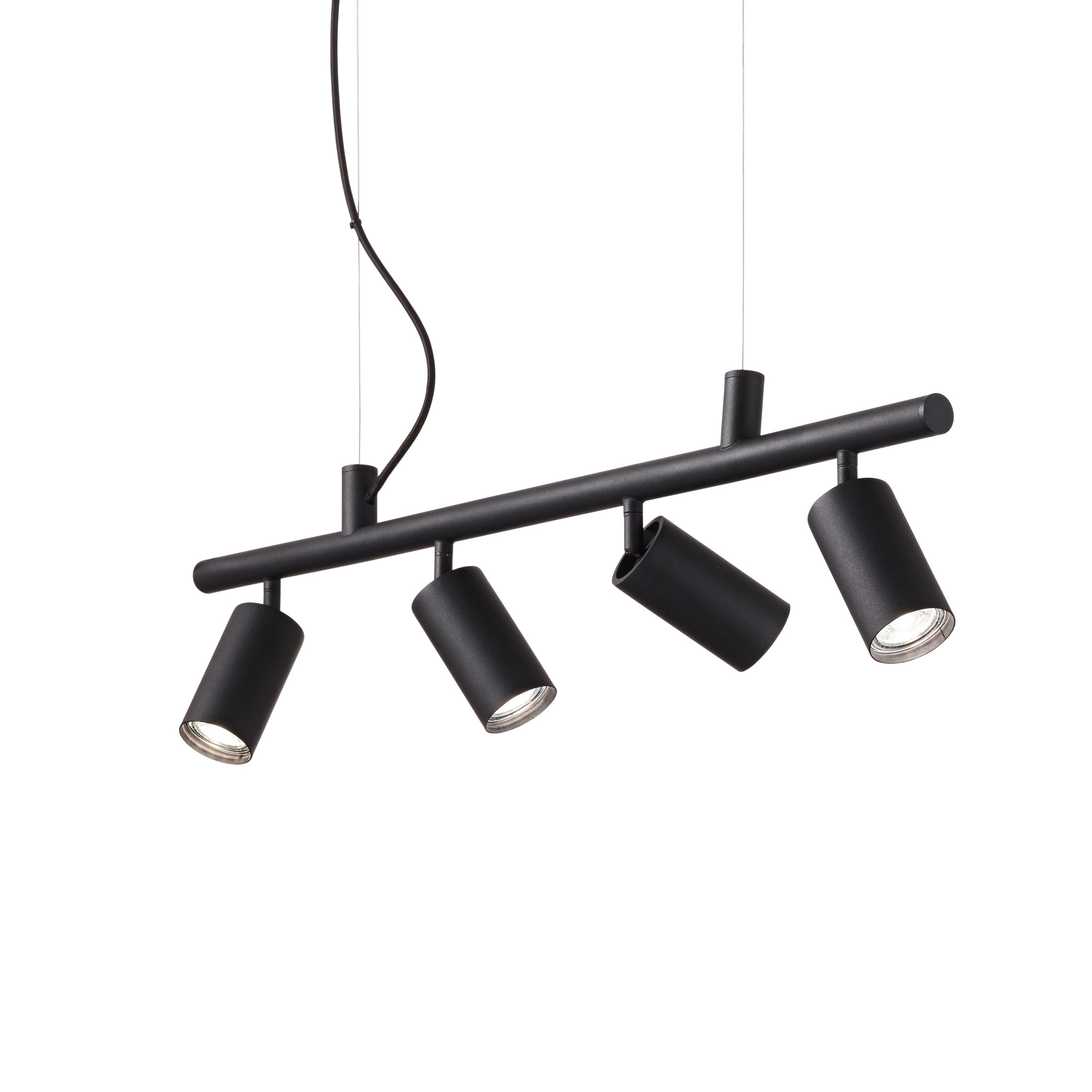 Lustre suspendu noir DYNAMITE SP4 d'Ideal Lux avec structure en métal fini avec peinture en poudre ou plaqué et brossé. Diffuseurs réglables. Câble électrique en tissu. Suspensions avec kit inclus pour installation au plafond. Ampoules incluses.