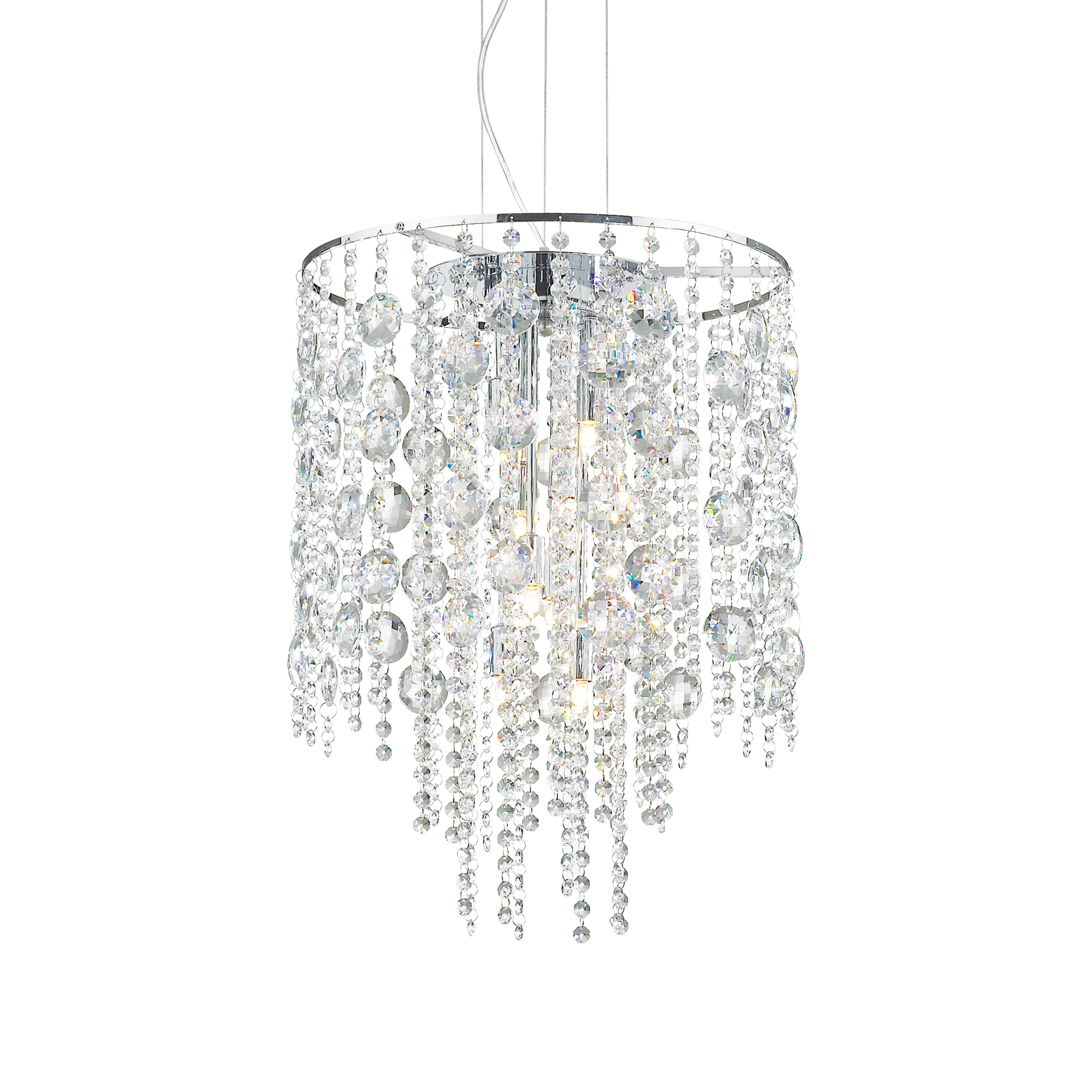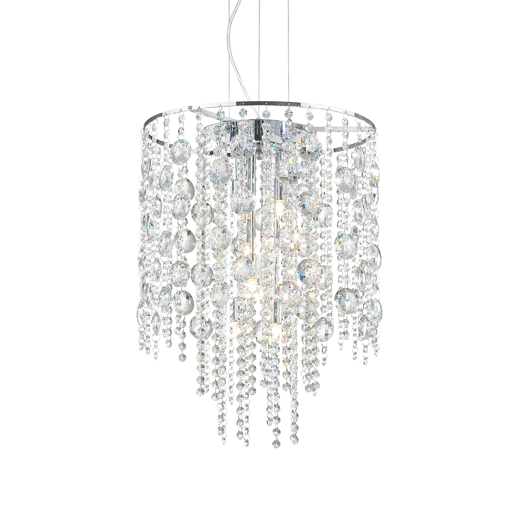 Lustre suspension EVASIONE SP8 d'Ideal Lux avec pampilles en cristal taillé. Suspensions avec câble en acier réglable en longueur par dispositif d'arrêt automatique du câble. Ampoules incluses.