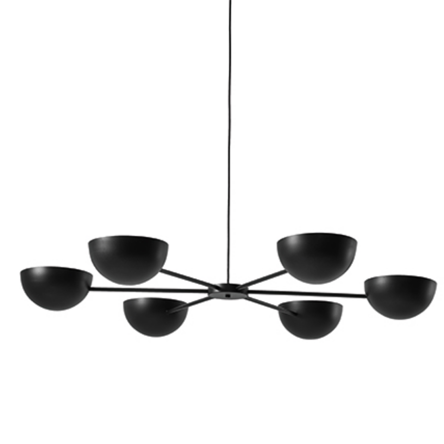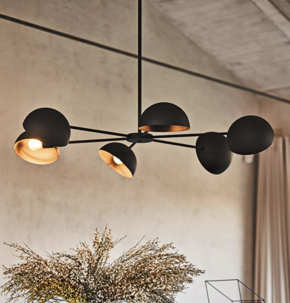 Les diffuseurs métalliques ont la forme de calottes hémisphériques, qui peuvent être ajustées en fonction des besoins ou des préférences individuelles, pour avoir une lumière directe ou indirecte.