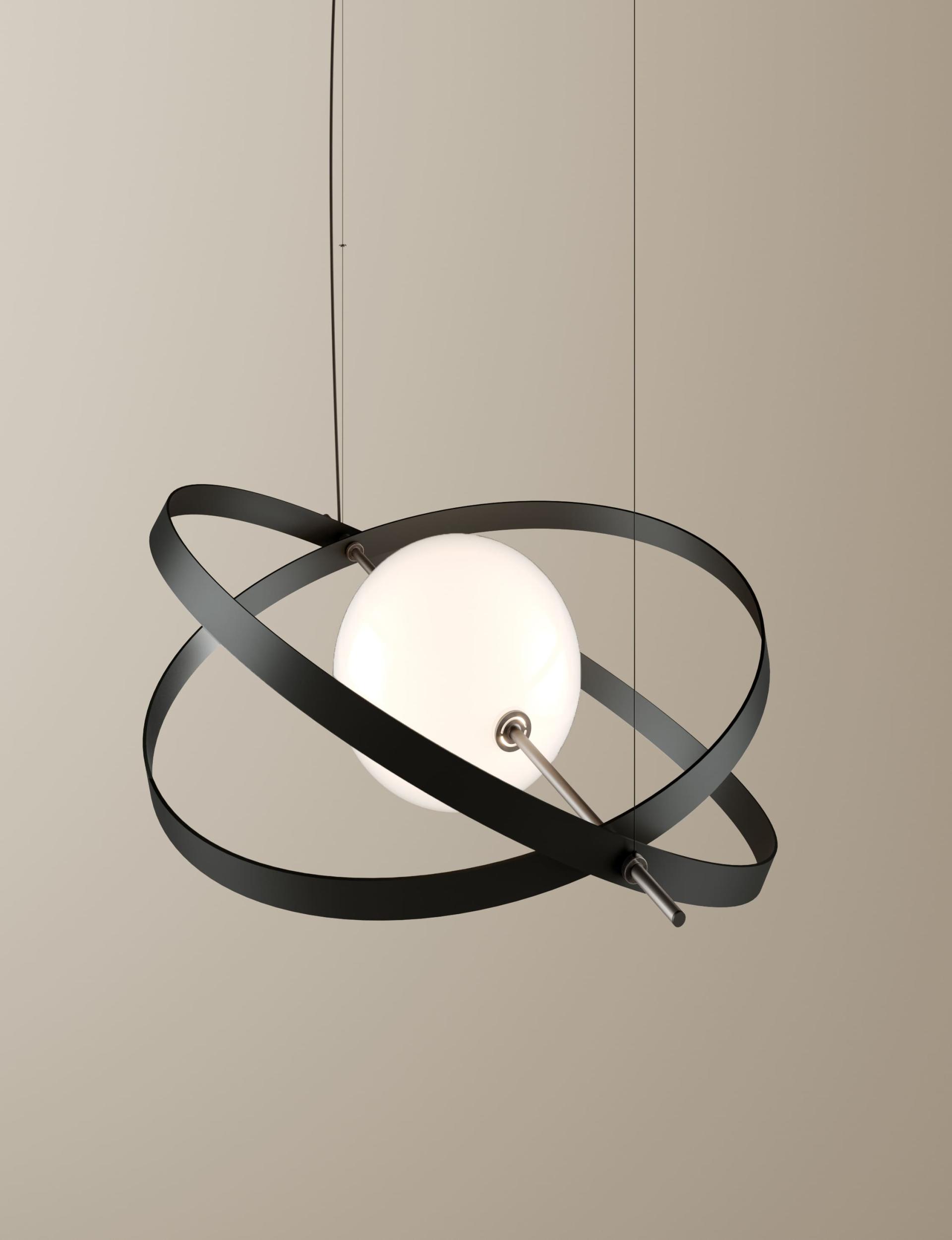 Lampe à suspension ou à fixation ciel/sol Papillon, avec structure en acier peint noir ou or mat et sphère en verre sablé. Disponible en deux versions : la version suspendue et celle à fixation ciel/sol.