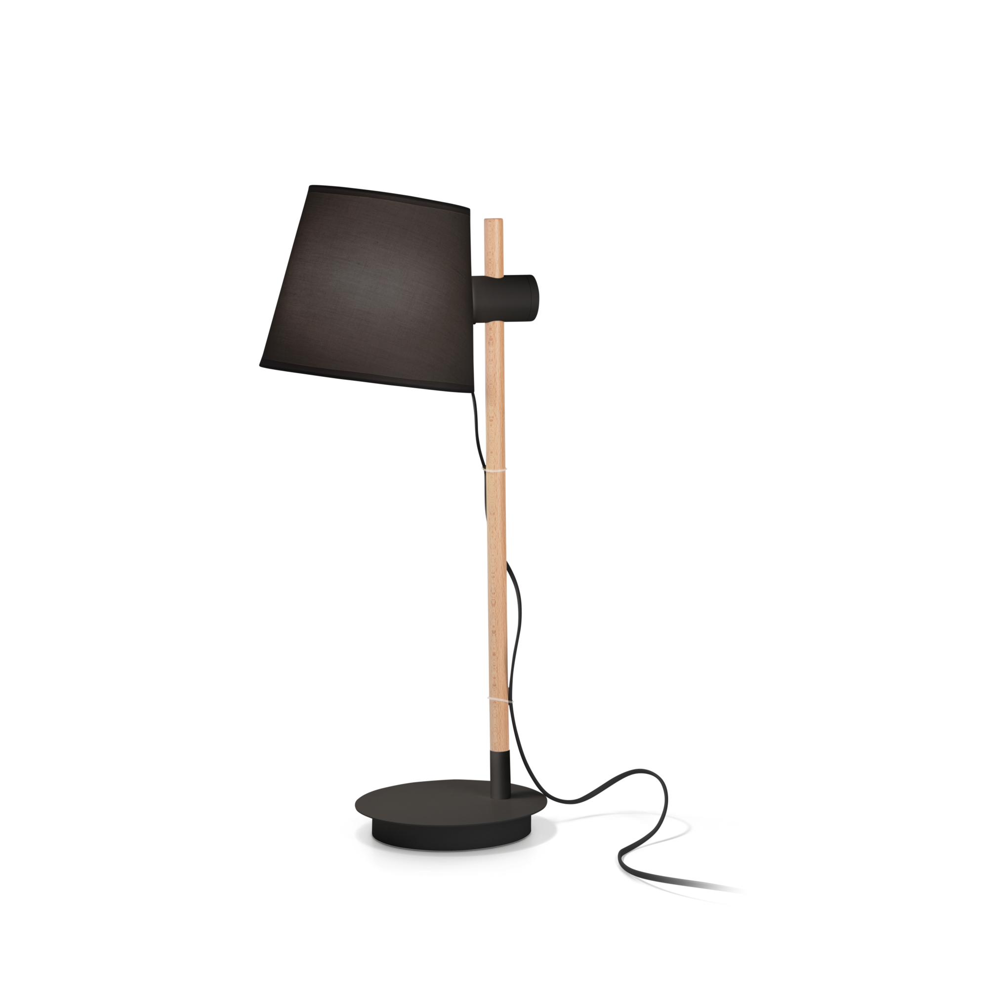 Lampe de table noire AXEL TL1 d'Ideal Lux avec base et garnitures en métal thermolaqué. Tige en bois naturel. Abat-jour réglable en hauteur, en PVC recouvert de tissu. Câble PVC avec interrupteur. Couleur noire. Lampe avec interrupteur intégré. Ampoule exclue.