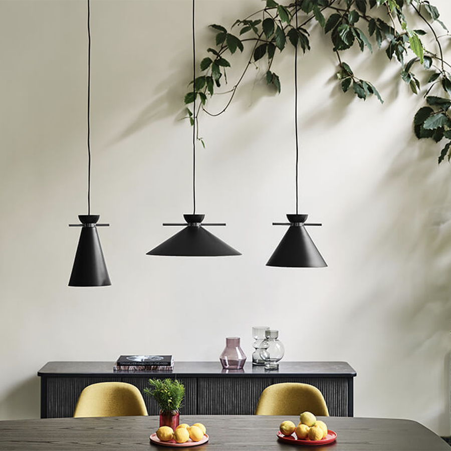 La collection se compose de trois suspensions et d'un lampadaire, tous à lumière diffuse et directe.