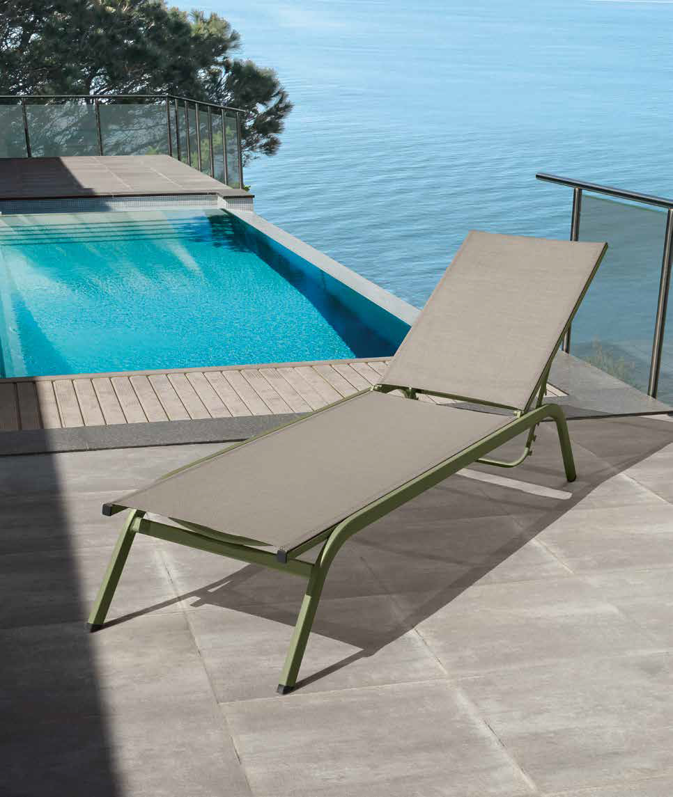 La gamme Step de Talenti propose cette chaise longue confortable et pratique aux lignes à la fois simples et élégantes. La chaise longue Step est disponible dans une variété de finitions pour la structure en aluminium et l'assise en textilène, et dispose d'un dossier réglable.
