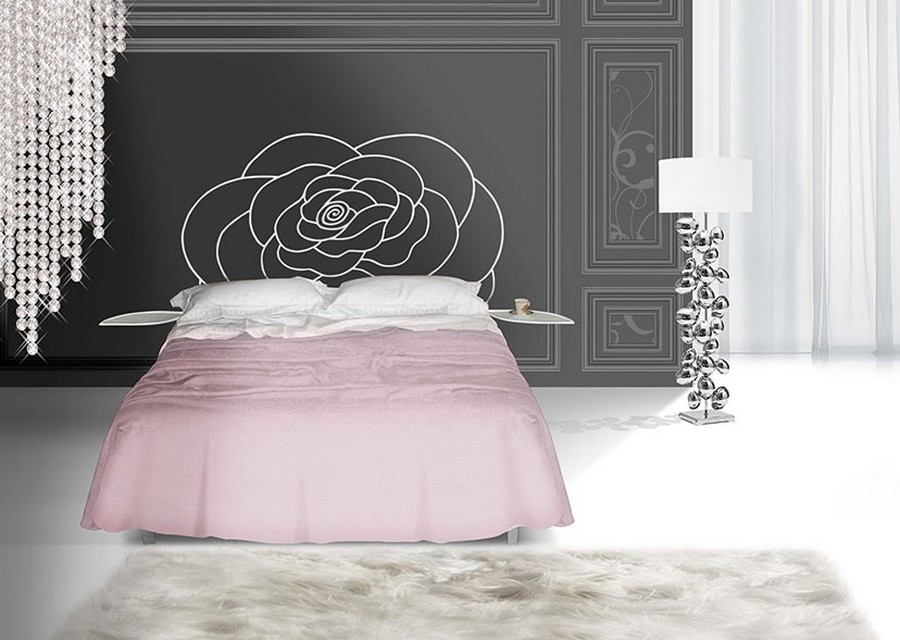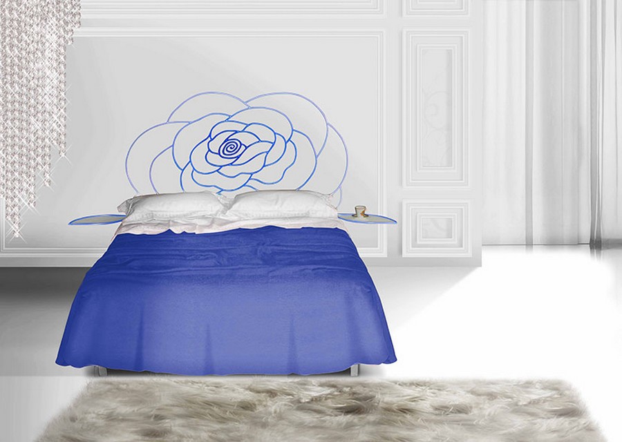 Possibilité d'ajouter une paire de tables de chevet Foglia de la même couleur que le cadre de lit avec un plateau en verre transparent comme indiqué sur la photo