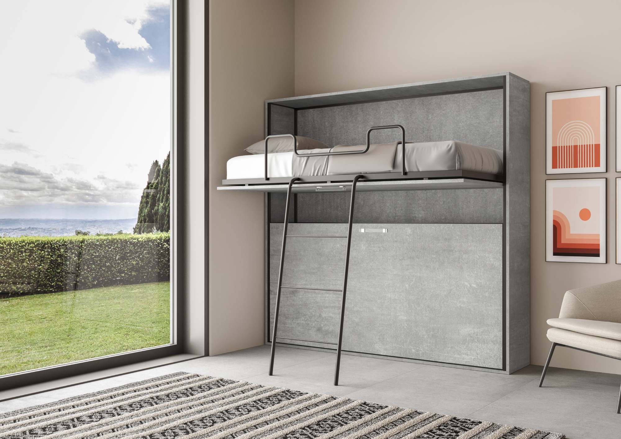 Lit escamotable horizontal Kando version avec deux lits simples superposés. Une solution gain de place pratique et originale qui optimise chaque centimètre carré et permet de transformer un espace séjour en chambre en quelques gestes. Idéal également pour les espaces restreints. Fermé, il occupe relativement peu de place, tandis qu'ouvert, il offre le même confort et le même repos qu'un lit simple classique. Structure du lit en panneaux de particules mélaminés de 18 mm d'épaisseur. Sommier renforcé en fer peint à la poudre époxy, couleur aluminium gaufré. Le mécanisme d'ouverture est équipé d'un système anti-fermeture avec verrouillage de sécurité et poignées latérales. Comprend un sommier orthopédique à lattes en bois lamellé de 85 x 190 cm avec sangles de maintien du matelas. Matelas non inclus. Dimensions recommandées pour le matelas : 85 x 185 cm H.max 14. Le lit reste stable grâce à un mécanisme de sécurité interne qui assure sa rigidité. Le lit peut être ouvert selon les besoins, uniquement le lit supérieur, uniquement le lit inférieur ou les deux simultanément. Le lit inférieur est équipé de pieds extractibles qui permettent de le poser au sol en toute sécurité, tandis que le lit supérieur est équipé d'échelles pratiques pour monter et descendre. La descente des lits est facilitée par les poignées fournies. Remarque importante concernant le montage : le lit escamotable Kando est livré démonté. Le montage est très complexe et nécessite deux personnes expertes. La fixation au mur est obligatoire. Dimensions : Lit fermé au mur : L.199,9 P.39,2 H.190,8 cm Lit ouvert : L.199,9 P.106 H.190,8 cm Hauteur du lit inférieur depuis le sol : 33 cm Hauteur du lit supérieur depuis le sol : 127 cm Fabriqué en Italie. Produit Itamoby