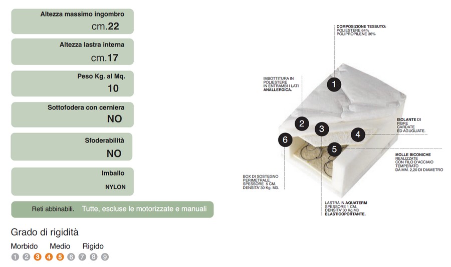 Le matelas est fait avec l'Europe ressorts biconiques (système BONNEL) hypersustentateurs tempéré, avec indéformable périmètre Boîte système de ressort. Une telle structure dans les sources traditionnelles, maintenant présent sur le marché depuis plus d'un siècle, soutenu par les nouvelles technologies, offre une rigidité et une flexibilité dans le temps et garantit des conditions de repos optimales. La dalle en mémoire lente viscoélastique mémoire donne le matelas un confort inégalé puisque chaque partie du corps est pris en charge en fonction du poids et de la pression exercée. Le système de boîte de support de périmètre élargi indéformables complètent ce matelas à ressorts traditionnels farce hypoallergénique.