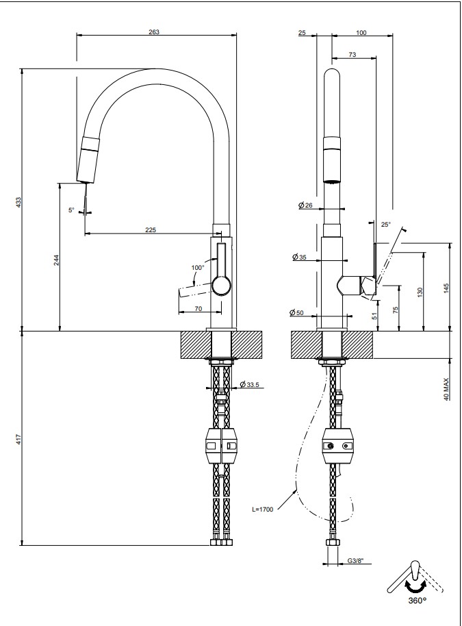 Bec pivotant et douchette extractible à jet unique. Un robinet élégant et fonctionnel pour votre évier de cuisine.