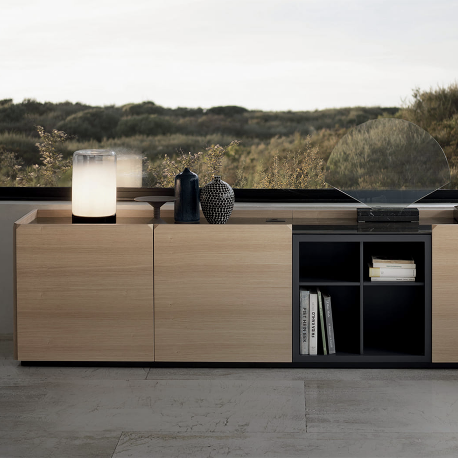 Groupe de buffets avec structure en bois, composé de portes battantes et de compartiments ouverts, côtés et portes en bois plaqué. Haut de votre choix. Avec socle ou cadre avec pieds en acier laqué.