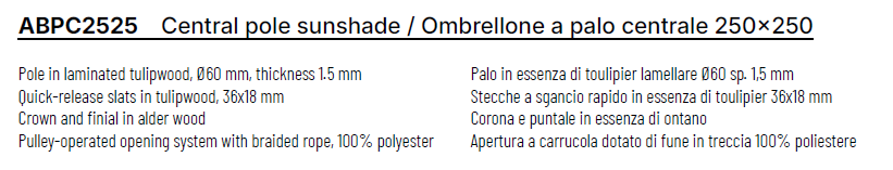 La structure est en bois de tulipier lamellé-collé de 60 mm de diamètre, un matériau choisi pour sa durabilité et sa stabilité dans le temps. Les baleines en bois de tulipier à démontage rapide permettent une manipulation simple et rapide, rendant le parasol adapté à un usage quotidien.