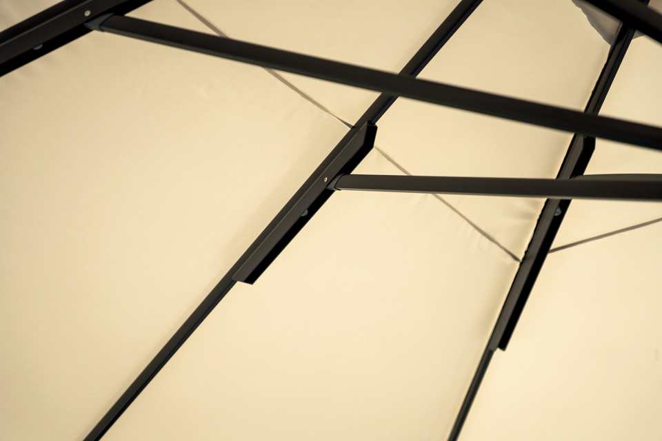 Les 12 nervures assurent une couverture optimale du tissu et une meilleure résistance aux intempéries. Le pare-brise favorise la ventilation, améliorant la stabilité même par grand vent.