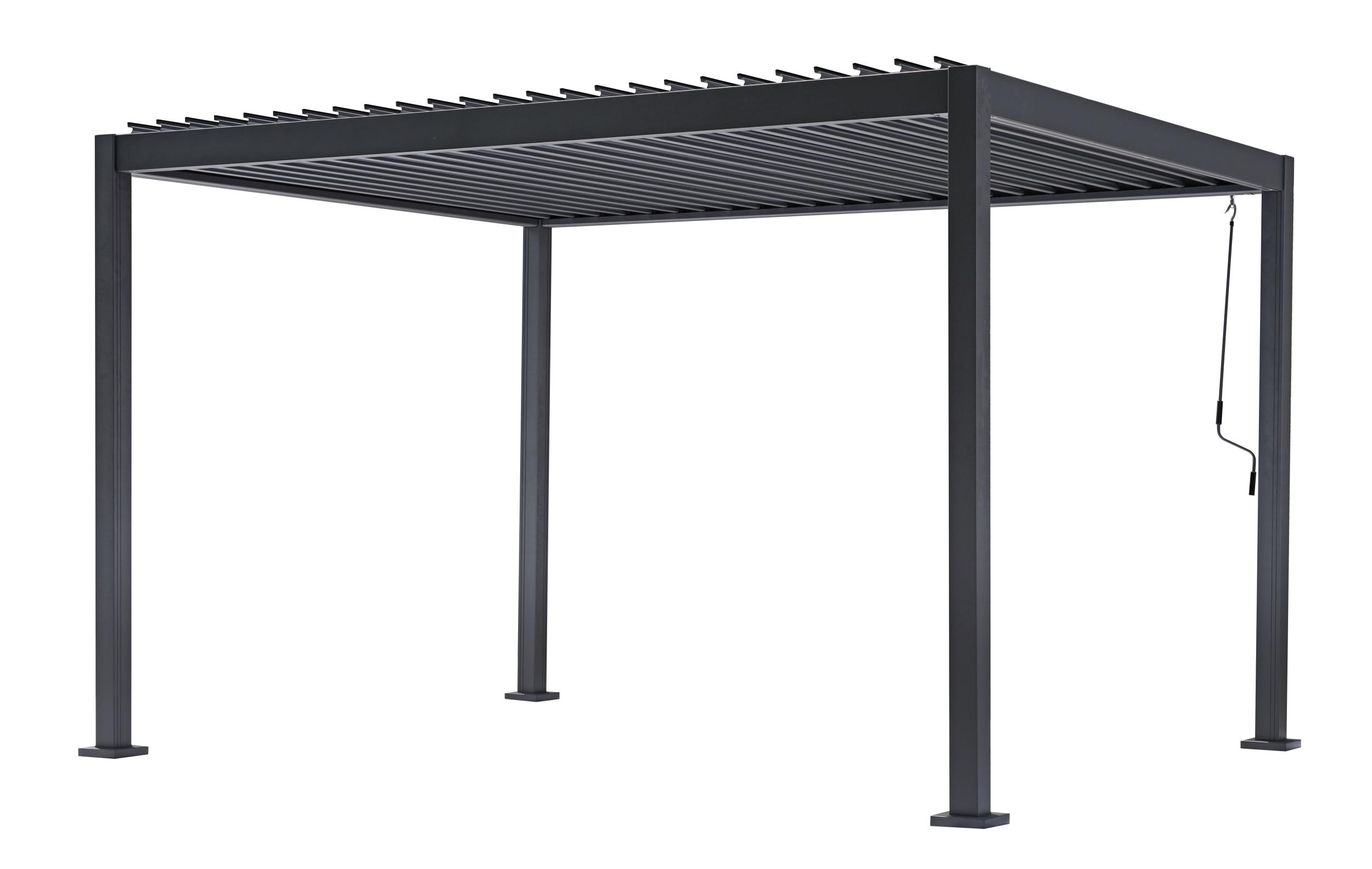 Avec structure en aluminium ANTHRACITE 105 x 105 x 1,3 mm, traverses de toit 145 x 80 x 1,3 mm, lattes 162 x 27 x 1,2 mm, toit à lattes réglable par manivelle, hauteur max 2,50 m, système d'évacuation d'eau intégré à l'intérieur des poteaux porteurs.
