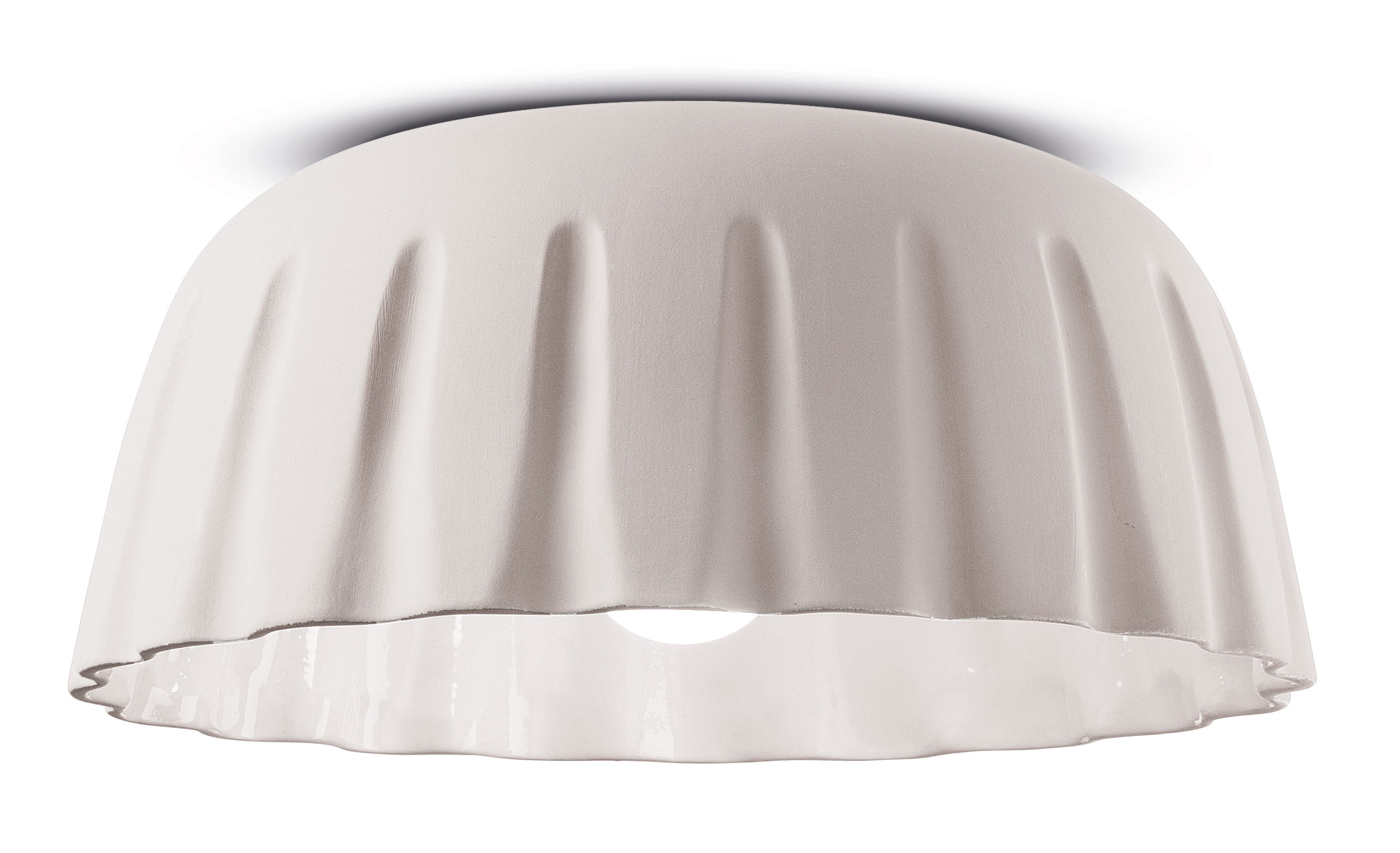 Avec ses surfaces ondulées et ses sculptures verticales répétées sur tout son périmètre, le diffuseur Madame Grès fait davantage penser à un vêtement plissé ou à un emballage textile doux et ondulé qu'à un élément rigide et statique. Ses surfaces, décorées d'une finition engobe opaque qui adoucit encore plus les formes, les rendant douces et soyeuses, s'ouvrent autour de la source lumineuse, générant un large faisceau de lumière qui éclaire de manière cohérente les environnements.
