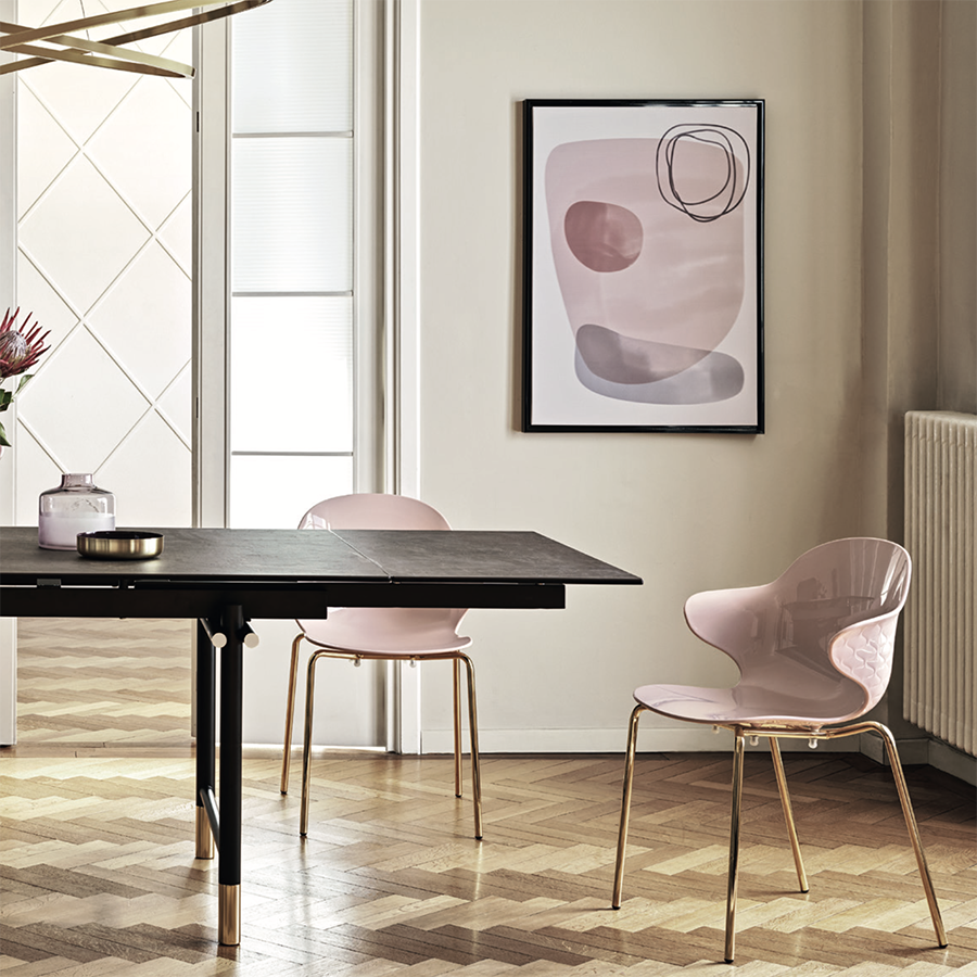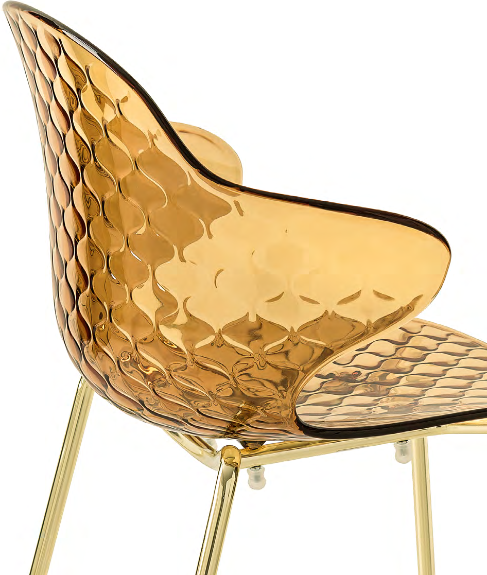 La coque en polypropylène ou en polycarbonate est disponible dans une variété de teintes transparentes ou opaques et repose sur un socle métallique empilable à quatre pieds. Choisissez votre modèle préféré.