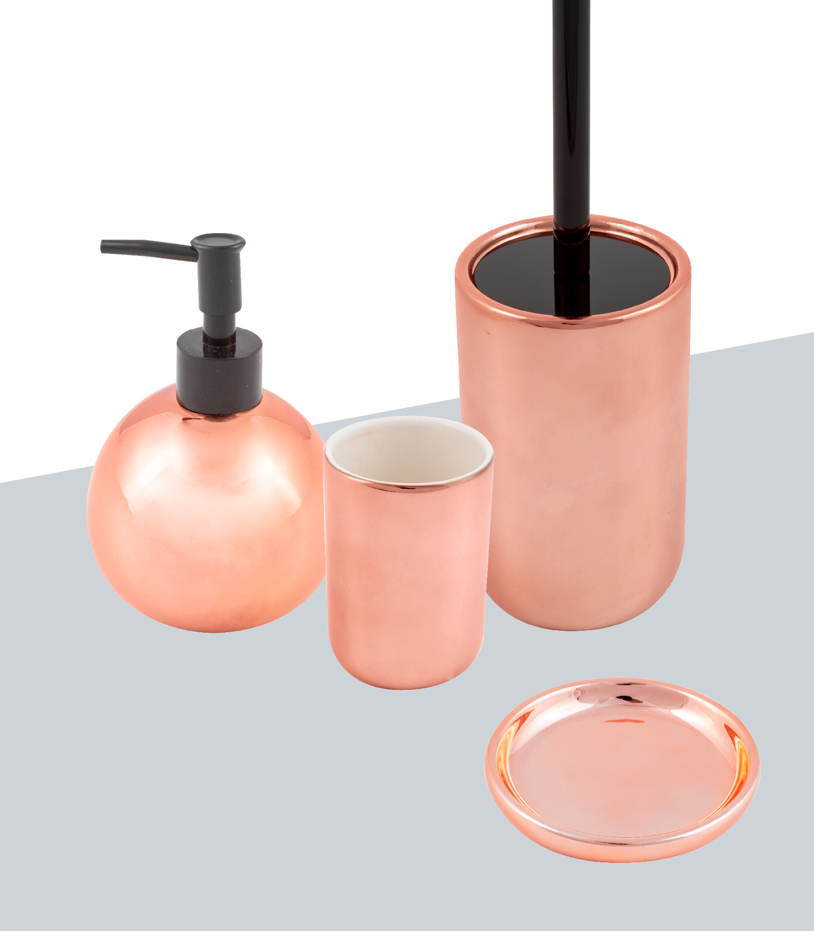Céramique chromée à décor "rétro", pompe distributrice en ABS, poignée et couvercle brosse WC en métal chromé. Couleurs disponibles : Oc Chrome, 23 Cuivre.