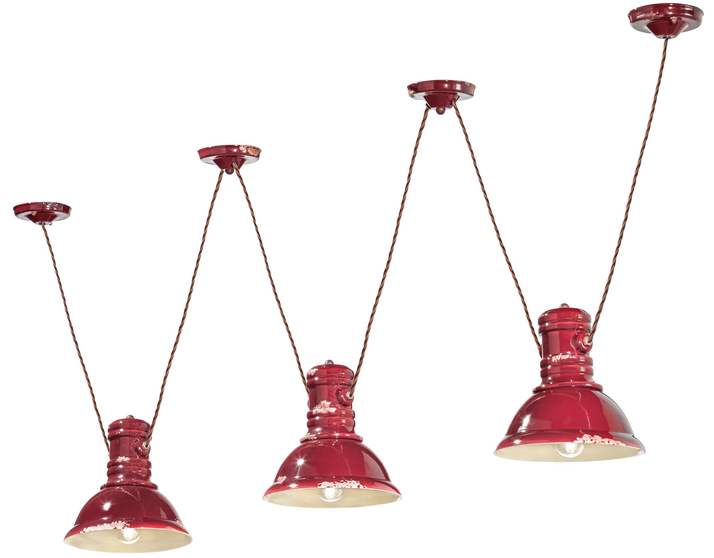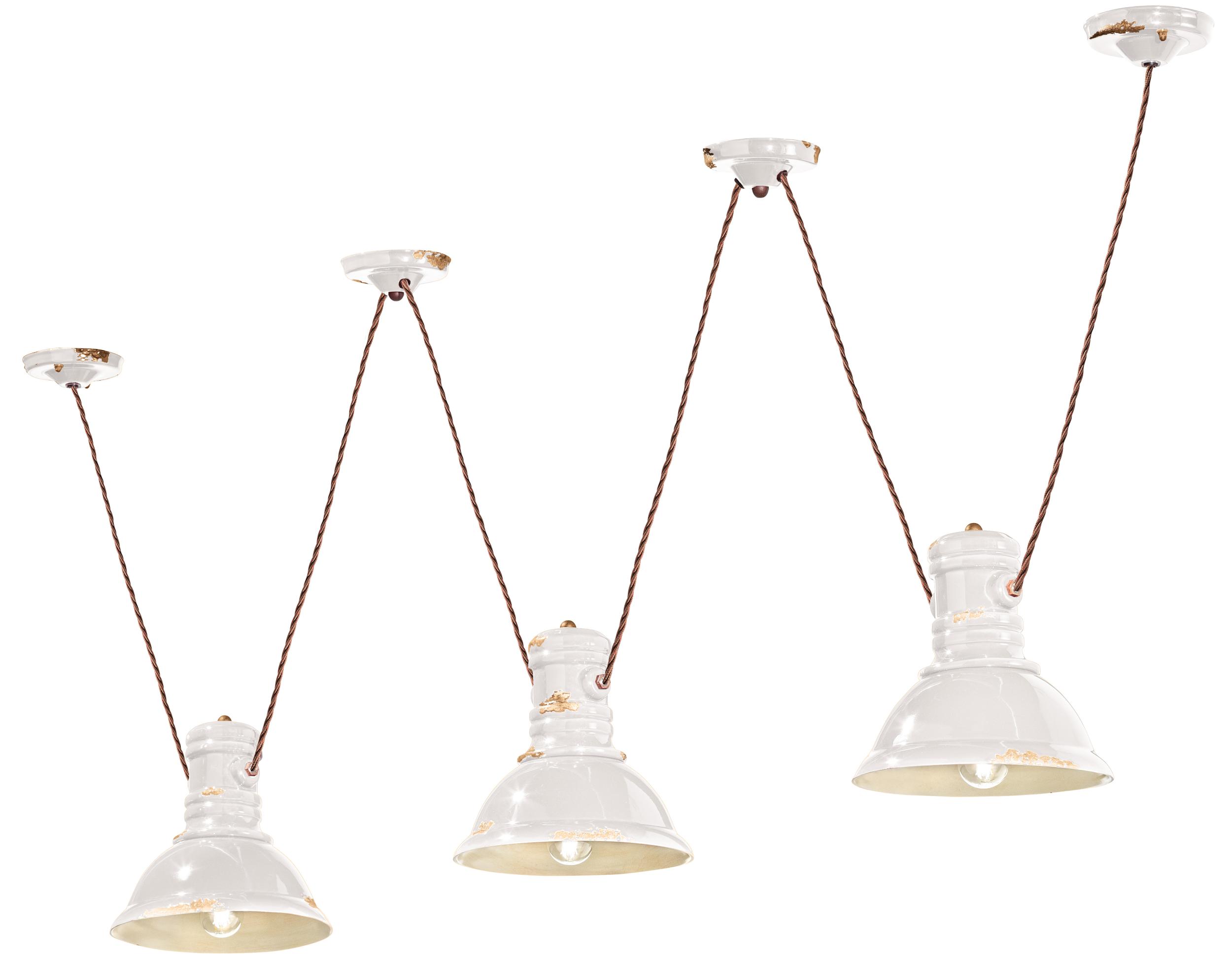 Suspension 3 lumières RETRO' INDUSTRIAL C1692 par Ferroluce. Lampe en céramique avec parties métalliques en fer corten vieilli et câble en coton recouvert.