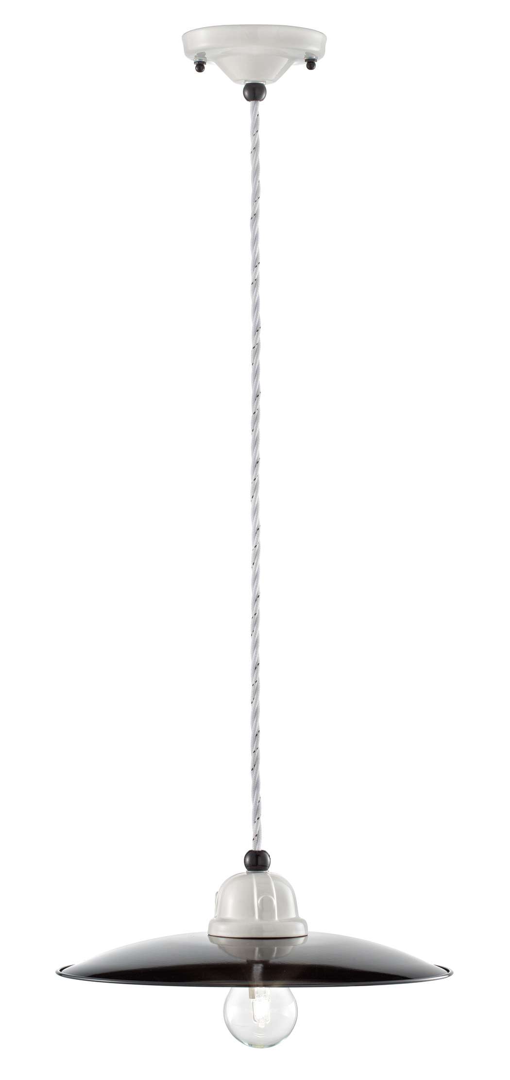 Lampe à suspension D.25 RETRO' B&W C1610 de Ferroluce avec rosace de fixation en céramique, câble en coton recouvert, parties métalliques en laiton, plaque de fer, type de peinture : poudre.