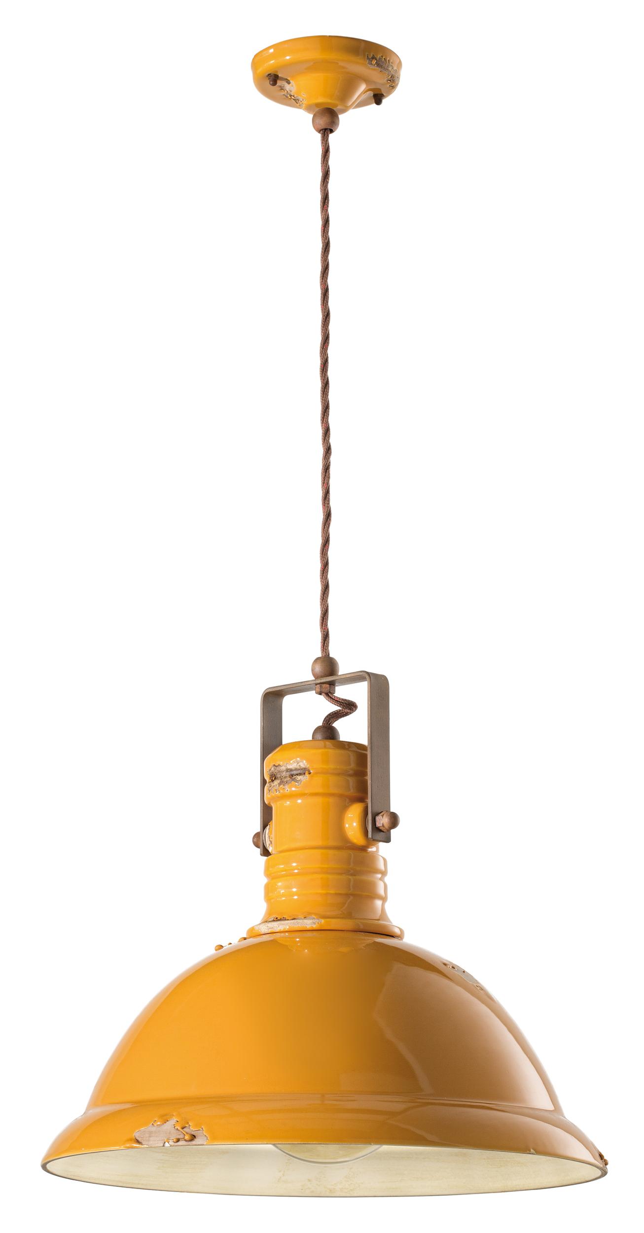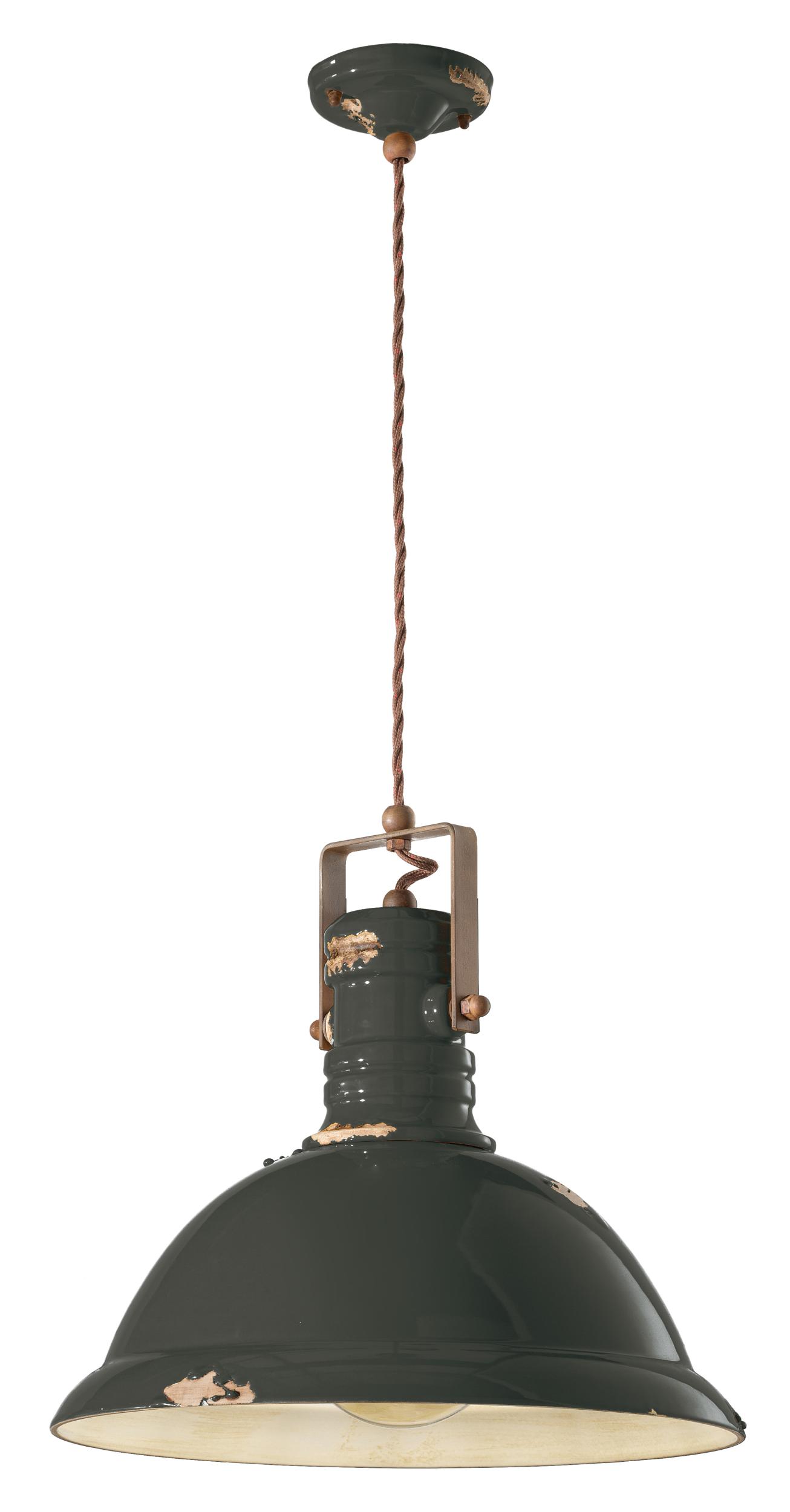 Lampe à suspension d.40 RETRO' INDUSTRIAL C1690 par Ferroluce. Lampe en céramique avec parties métalliques en fer corten vieilli et câble en coton recouvert.