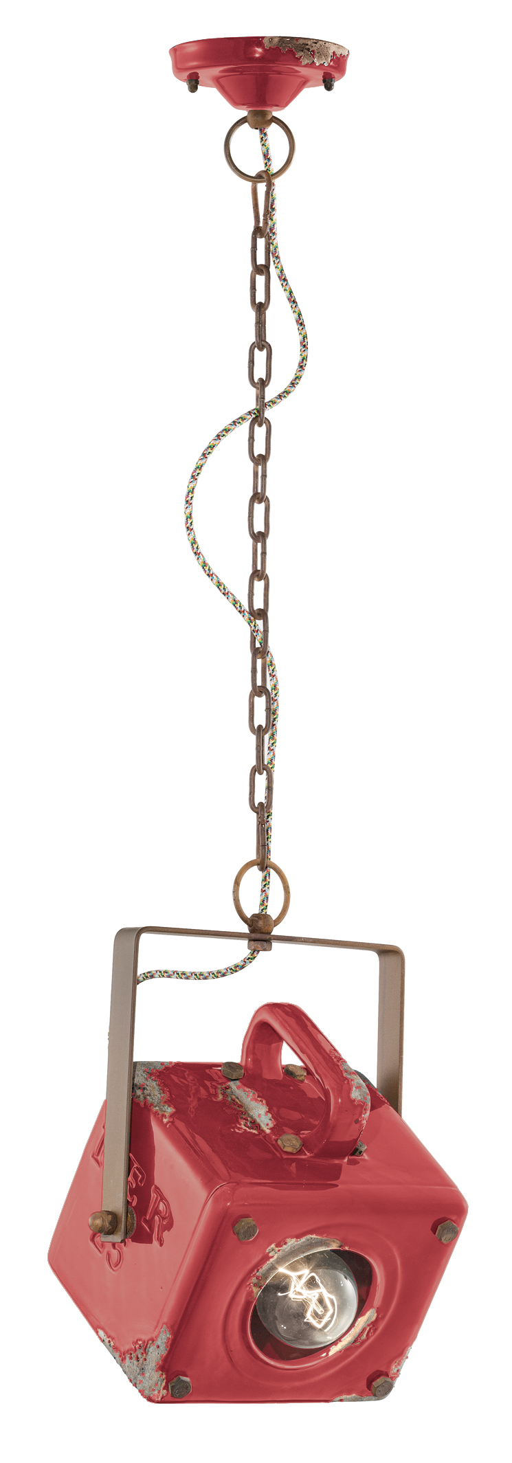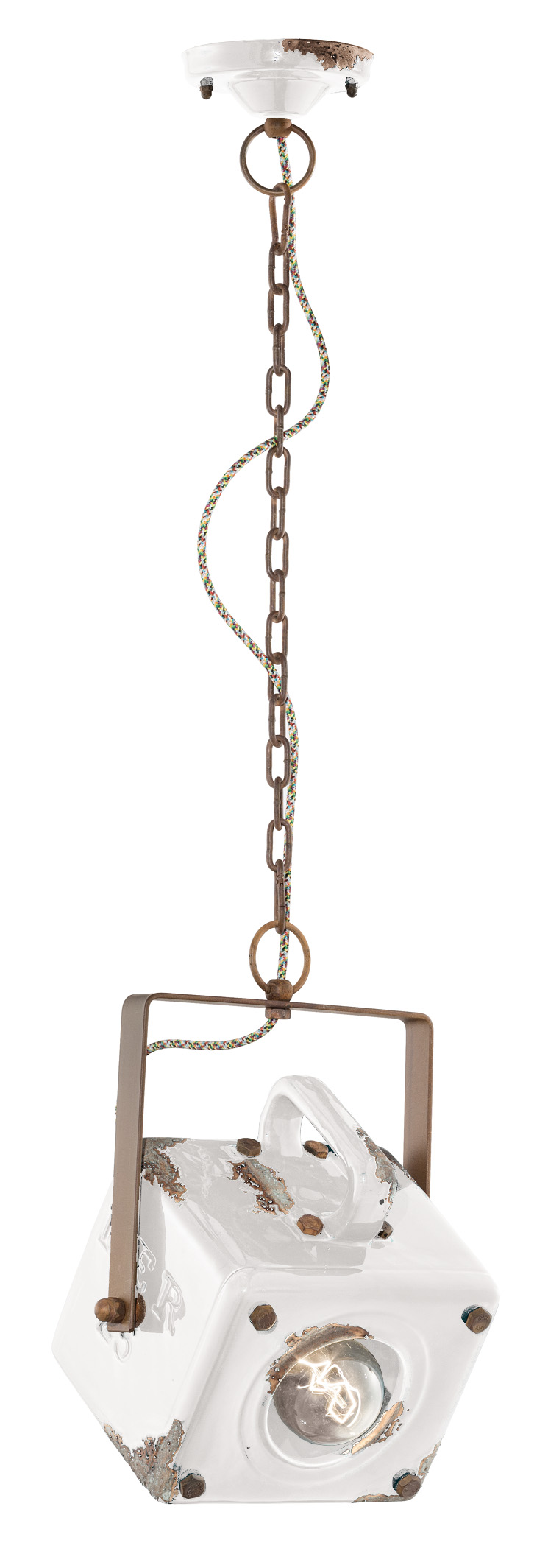 Lampe à suspension RETRO' INDUSTRIAL C1652 de Ferroluce. Lampe en céramique avec parties métalliques et chaîne en fer corten antique et câble en coton recouvert multicolore.