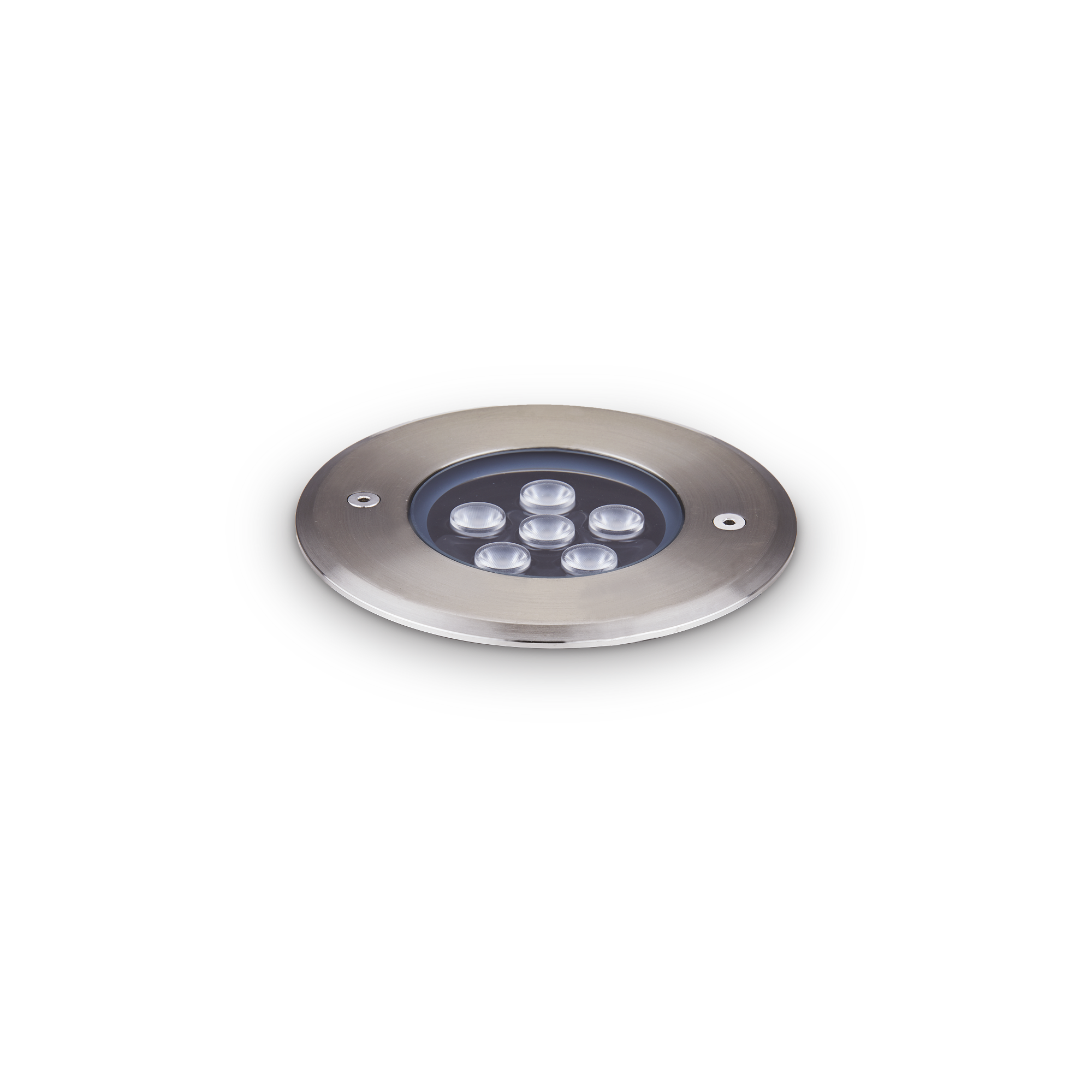 Encastré d'extérieur fixe en aluminium moulé sous pression avec collerette ronde, disponible en trois tailles, pour une installation encastrée dans le sol ou au sol. Finition aluminium anodisé avec diffuseur en verre trempé extra-clair. LED intégrées à refroidissement passif avec optique 30° ; température de couleur 3 000 K et IRC ≥ 80 ; indice de protection IP 67 ; IK 10.