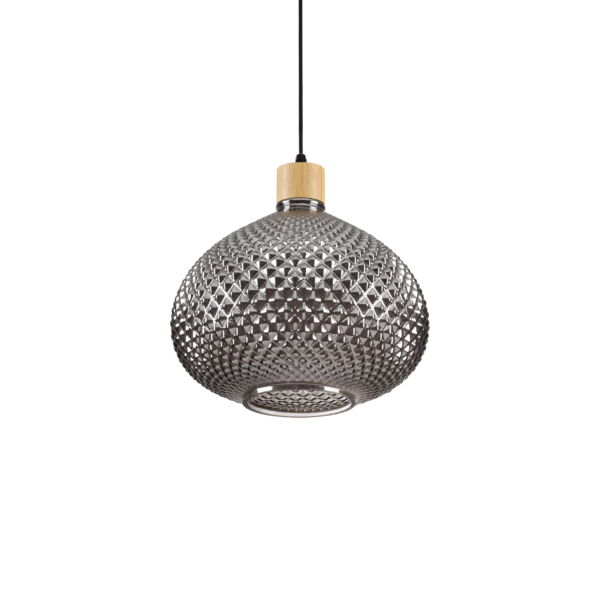 Lampe à suspension BERGEN-3 SP1 d'Ideal Lux avec rosace en métal thermolaqué noir. Cadre en bois naturel. Diffuseur en verre soufflé transparent avec motif décoratif en relief et finition fumée. Câble recouvert de tissu. Ampoule exclue.