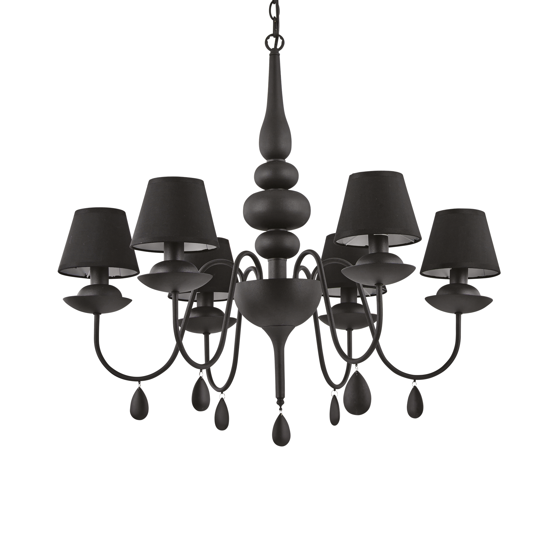 Suspension noire BLANCHE SP6 d'Ideal Lux avec structure en métal finition émail satiné noir. Abat-jour en film PVC recouvert de tissu noir. Cache chaîne en velours. Ampoules exclues.