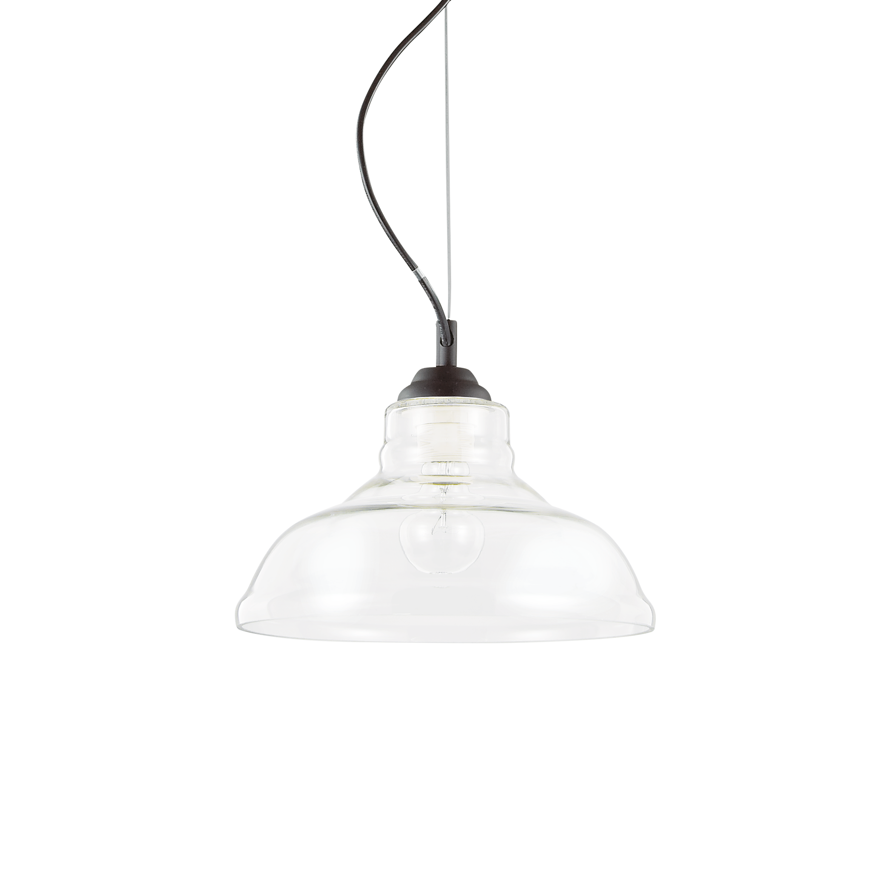 Suspension à plaque transparente BISTRO' SP1 d'Ideal Lux avec structure en métal peint en noir. Diffuseur en verre transparent soufflé et façonné à la bouche. Ampoule exclue.