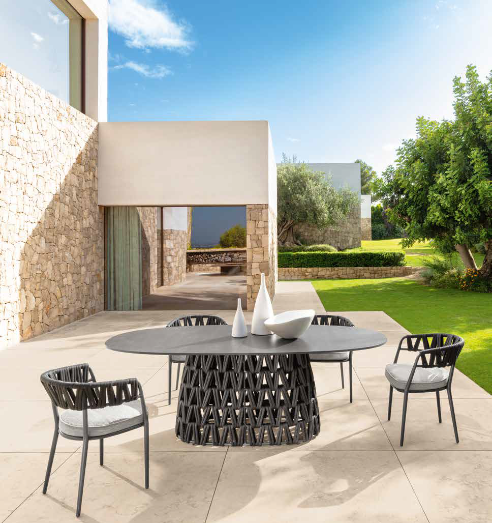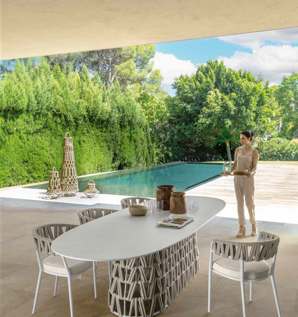 La table de salle à manger Swipe allie légèreté et convivialité grâce au design ludique de ses différents éléments. Inspirée par le concept de mouvement, elle se distingue par son plateau fin en grès cérame qui semble flotter grâce à un subtil jeu de transparences créé par le tressage en corde rembourrée dissimulant la structure en aluminium massif. Le motif géométrique du piètement confère une atmosphère élégante au jardin et à l'espace de vie extérieur.