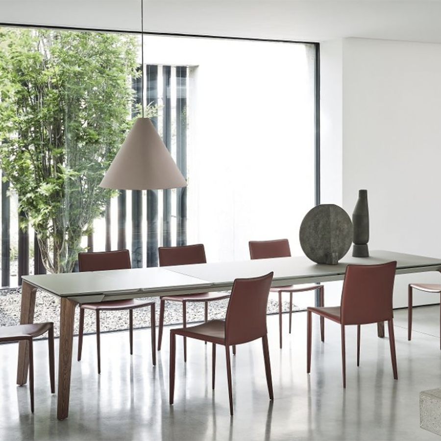 La table Versus de Bontempi, extensible ou fixe, carrée ou rectangulaire, est fabriquée avec une structure en aluminium laqué assortie au plateau et des pieds en bois massif disponibles en différentes finitions. Une table design pour meubler avec goût votre salon.