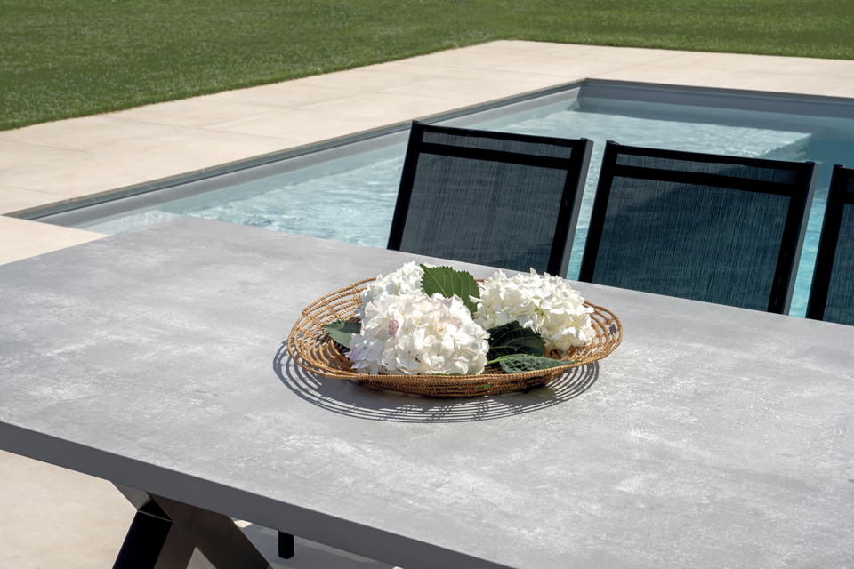 Le plateau en résine grise offre une surface robuste et pratique, idéale pour un usage quotidien. Ce matériau est facile à nettoyer et conçu pour conserver son aspect au fil du temps, même exposé au soleil, à l'humidité ou à une utilisation fréquente.