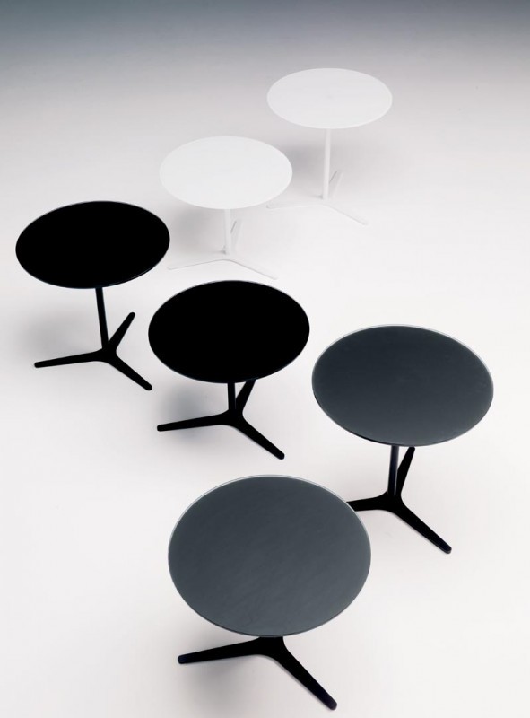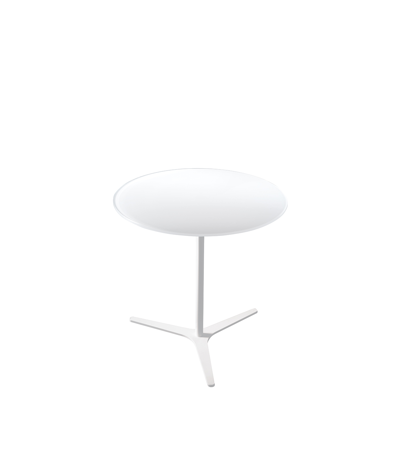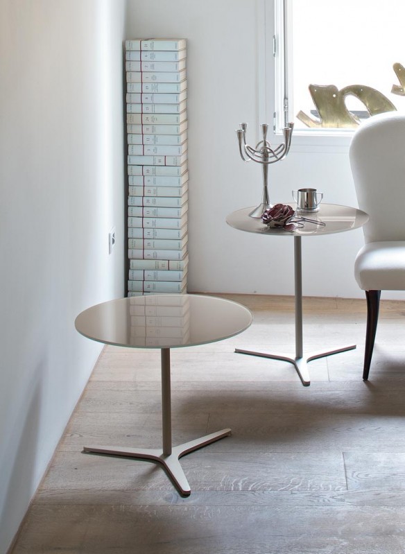 Table basse pour salon ou bureau avec plateau rond en verre, structure en acier laqué et disponible en deux hauteurs différentes.