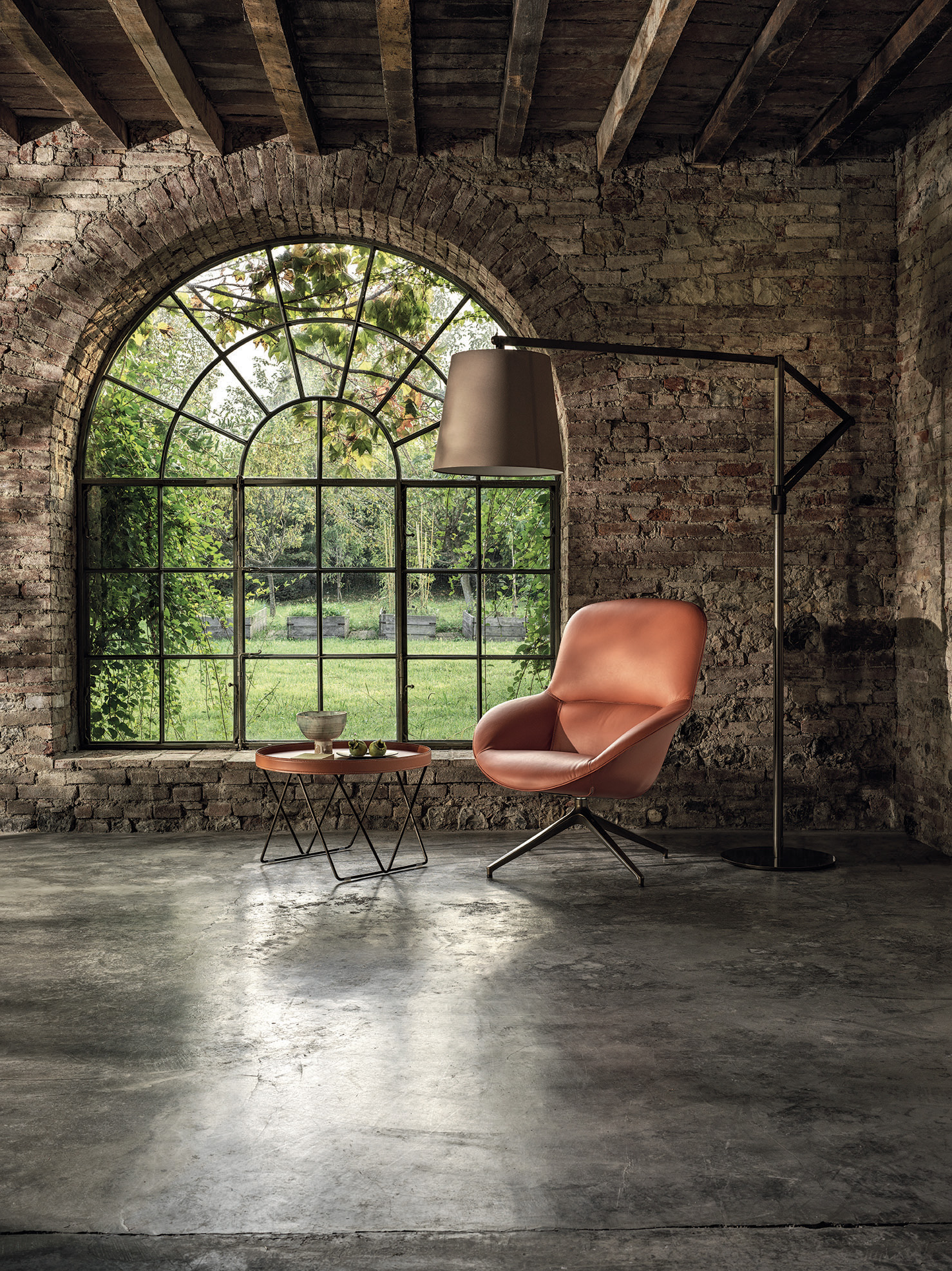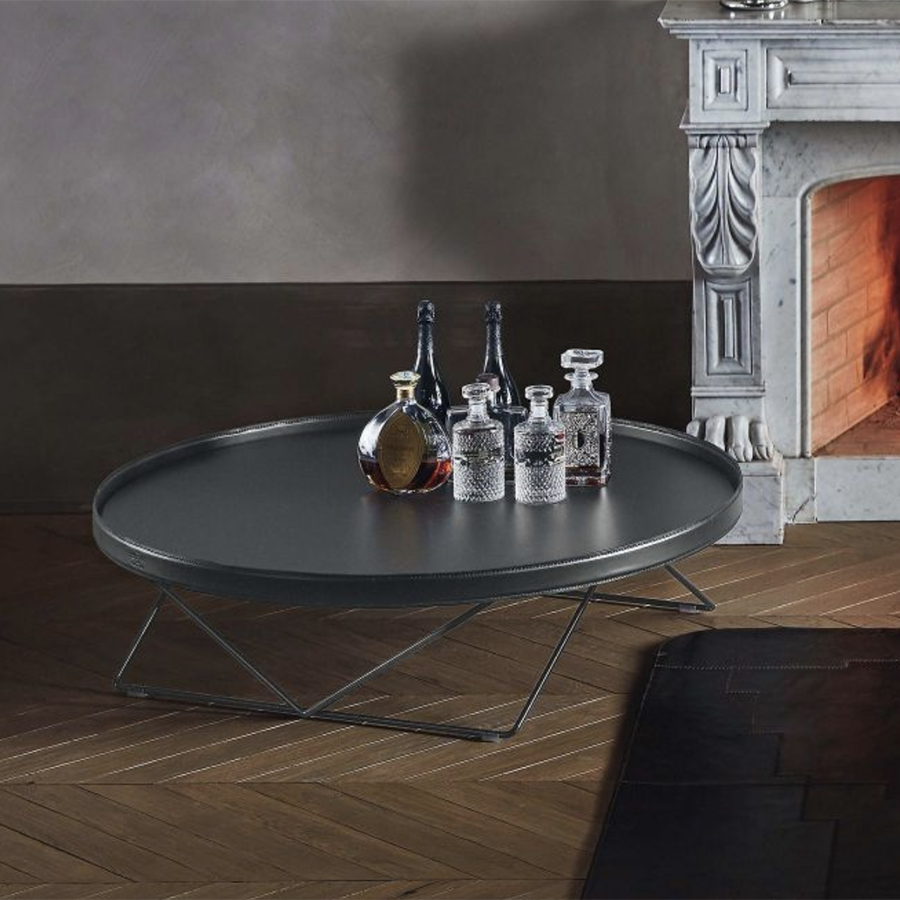Table basse avec structure en acier laqué. Dessus en cuir avec surpiqûres assorties ou contrastées.