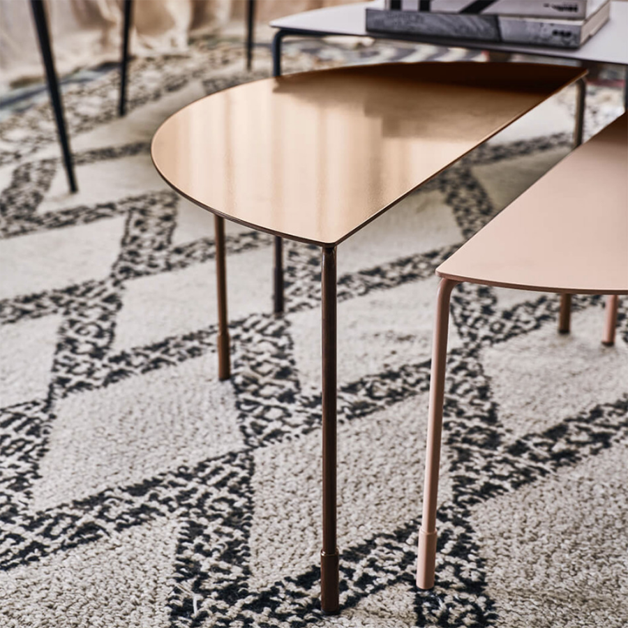 La collection Hoodi se compose de trois tables en forme de demi-lune, de dimensions et de hauteurs différentes.