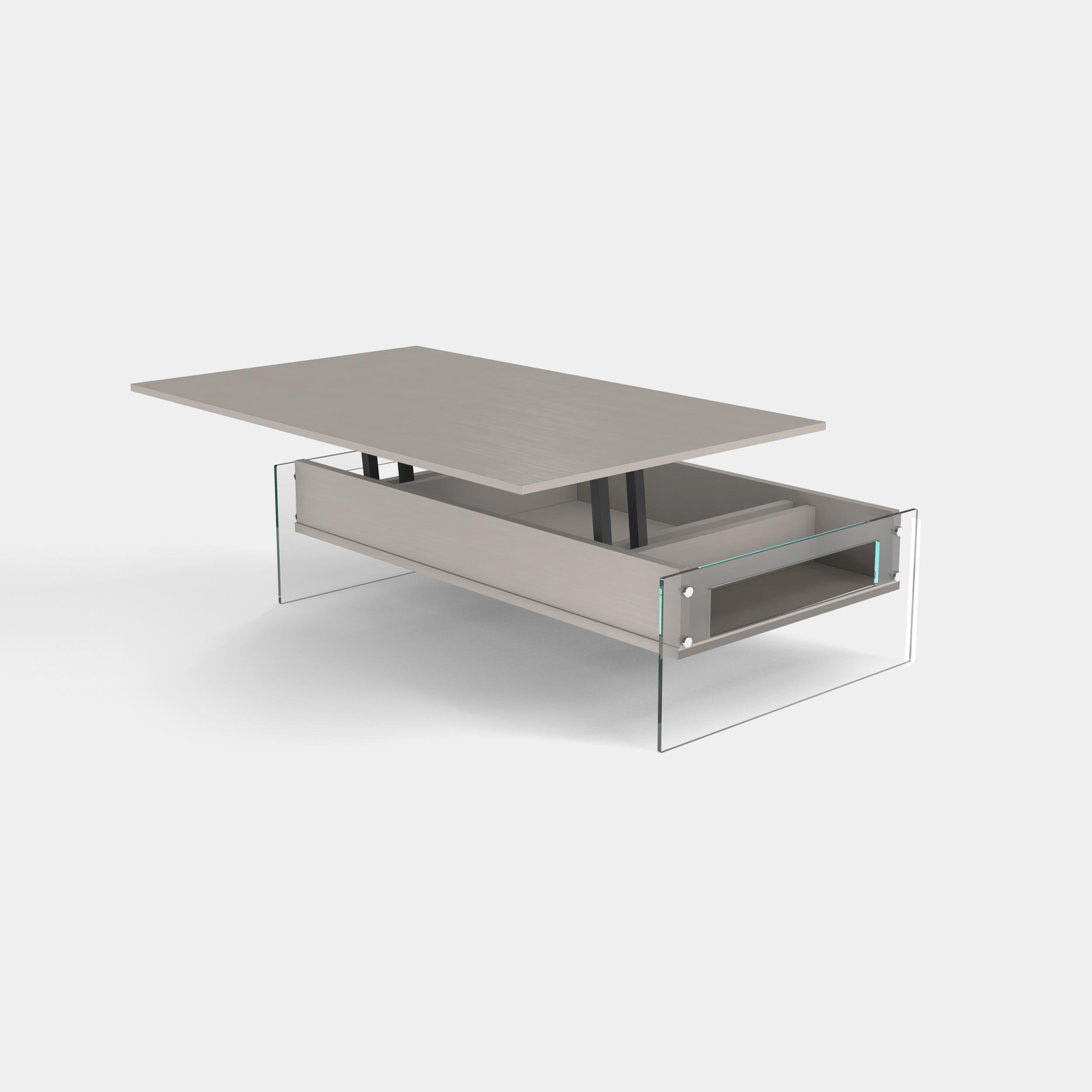Table basse London de Pezzani, multifonctionnelle, avec son plateau relevable dissimulant un compartiment de rangement pratique. Fabriquée en stratifié écologique avec des côtés en verre trempé transparent. Disponible en plusieurs coloris et deux tailles. Un design raffiné et élégant pour le salon.