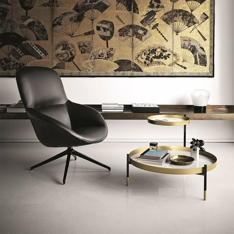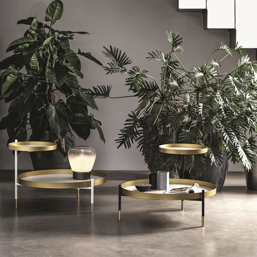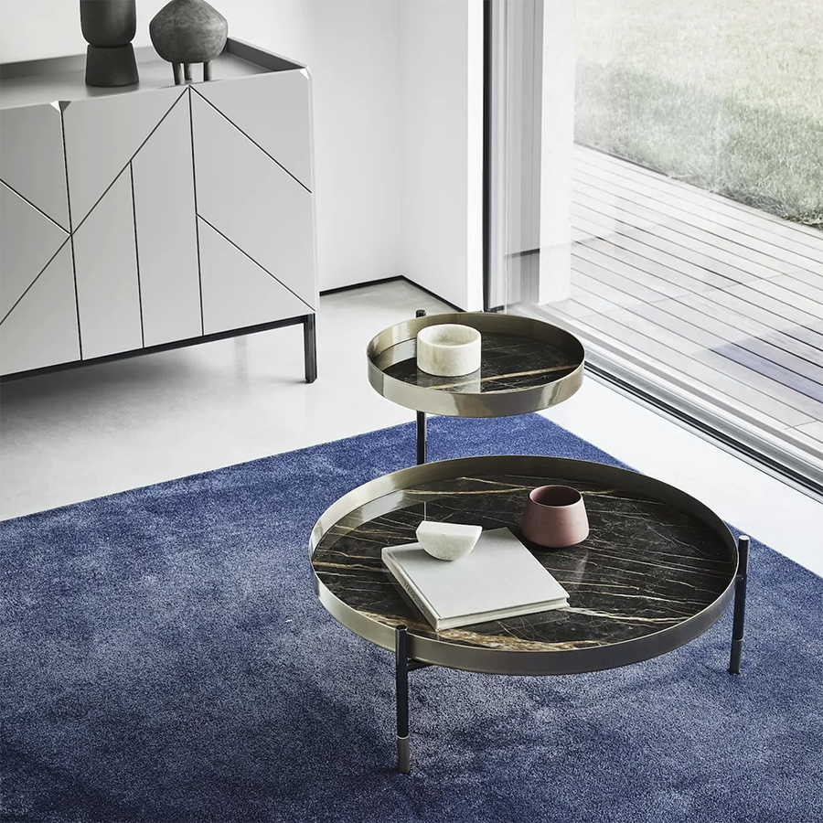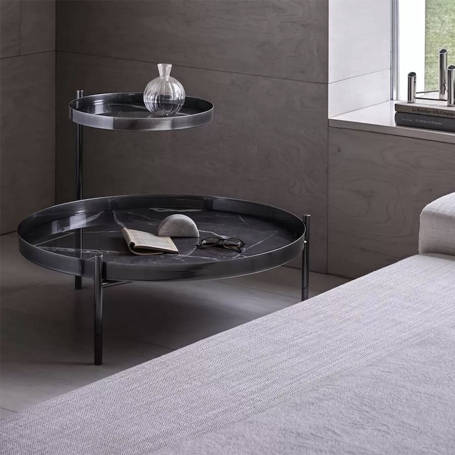 Table basse à deux niveaux dont un réglable et une table basse à un seul niveau avec structure en acier laqué. Plateau disponible dans de nombreuses finitions. Structure et détails décoratifs (pieds et cadres plats) en acier laqué.