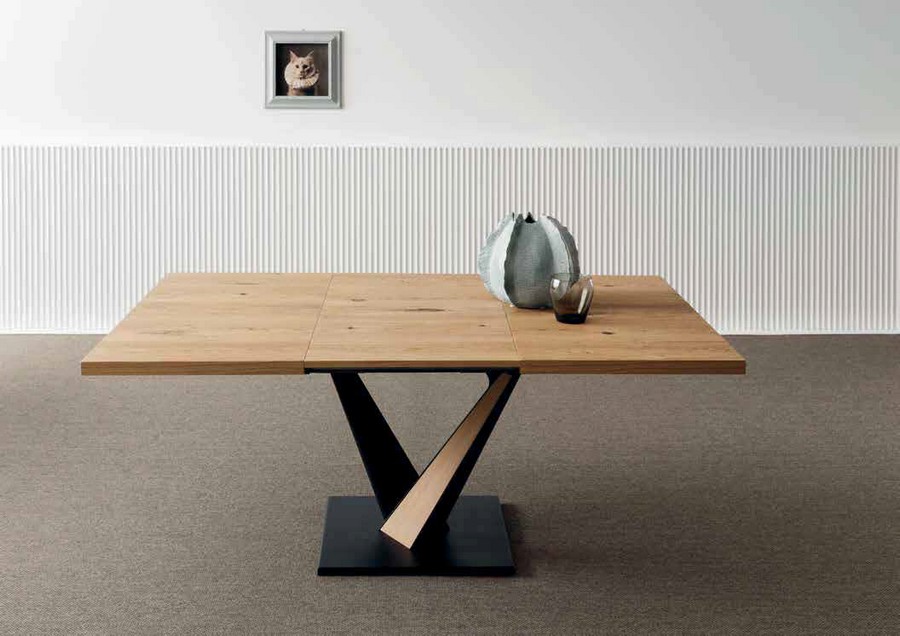 Table extensible carrée West d'Altacorte avec système d'extension Book et base en métal dans différentes finitions de votre choix. Plateau brossé de 4 cm d'épaisseur disponible en différentes finitions. Le système d'ouverture Book permet l'extension centrale de 60 cm rapidement et facilement.