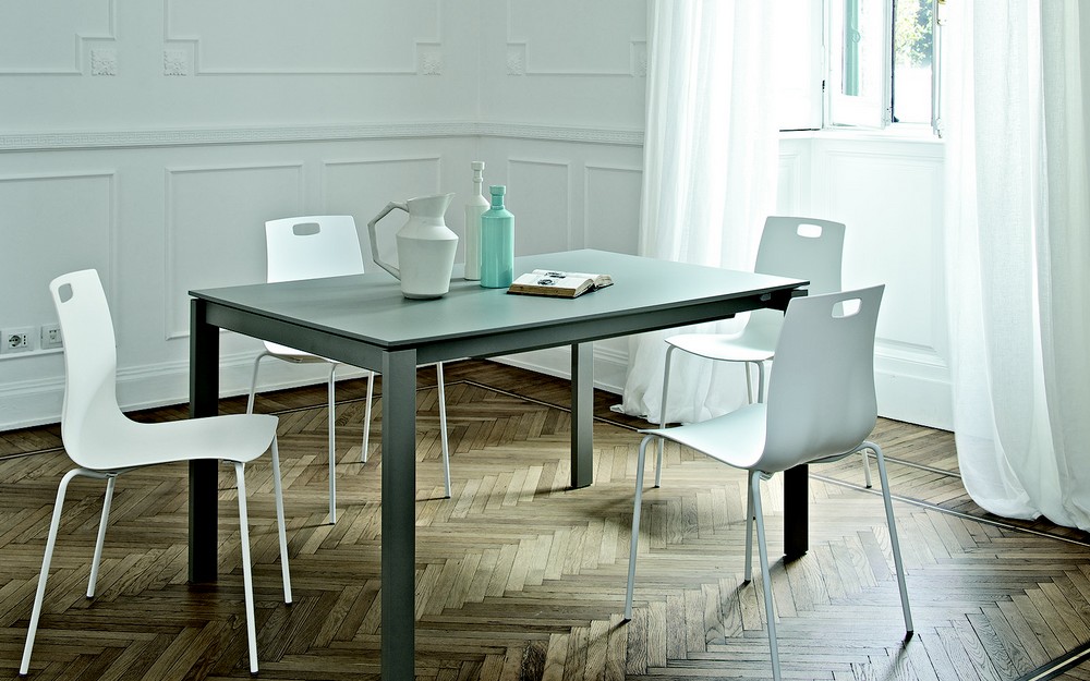 Reid est équipé de trois rallonges qui de 140 cm prolongent la table à 290 cm, avec un mécanisme d'extension en aluminium laqué de la même couleur que la structure. Le plateau est disponible en mélamine, mélamine Materico, stratifié Fenix , bois laqué, verre ou SuperCeramica, la structure est en acier laqué en différentes finitions. Caractérisé par sa ligne simple et épurée, il s'adapte à tout type d'environnement domestique.