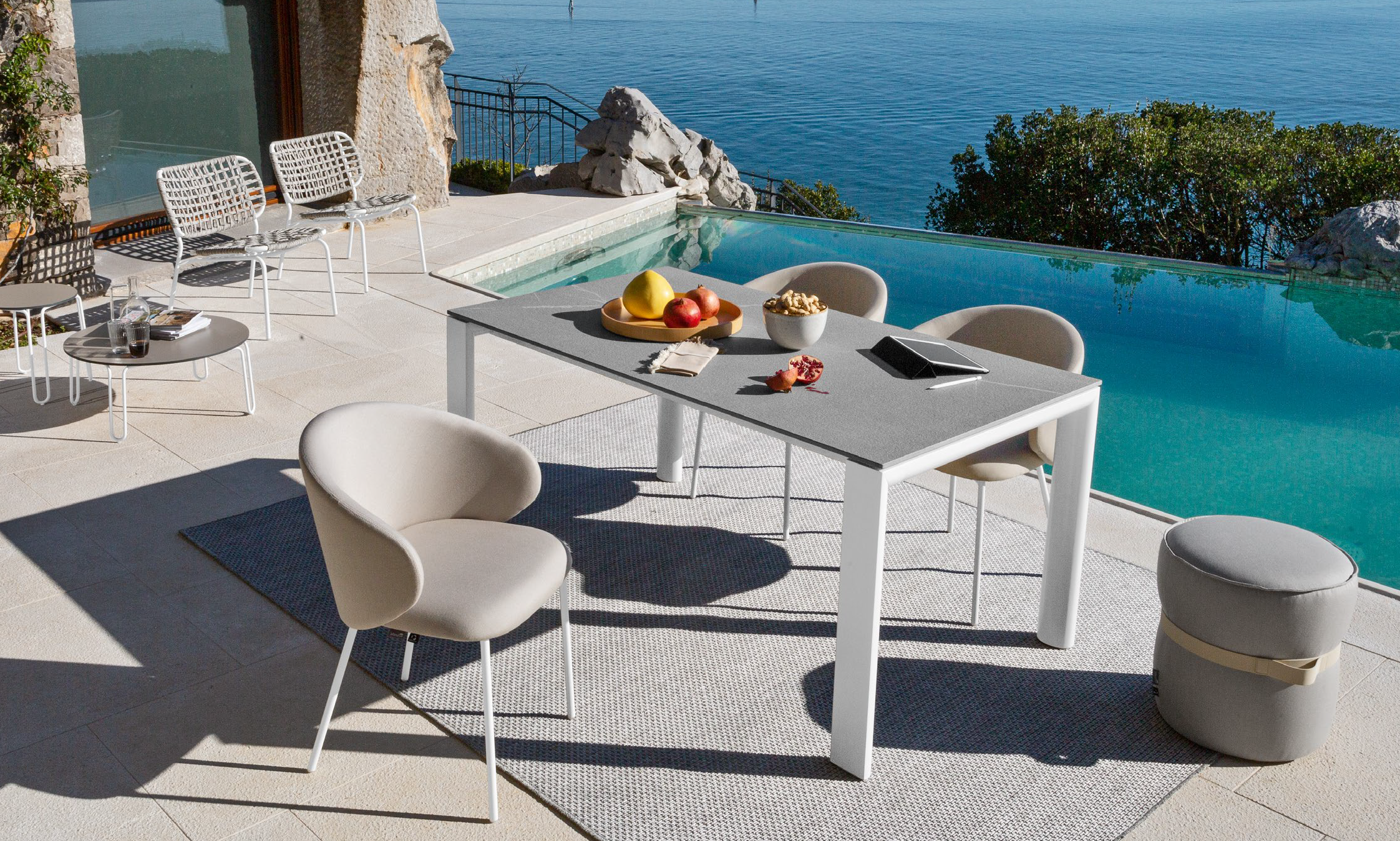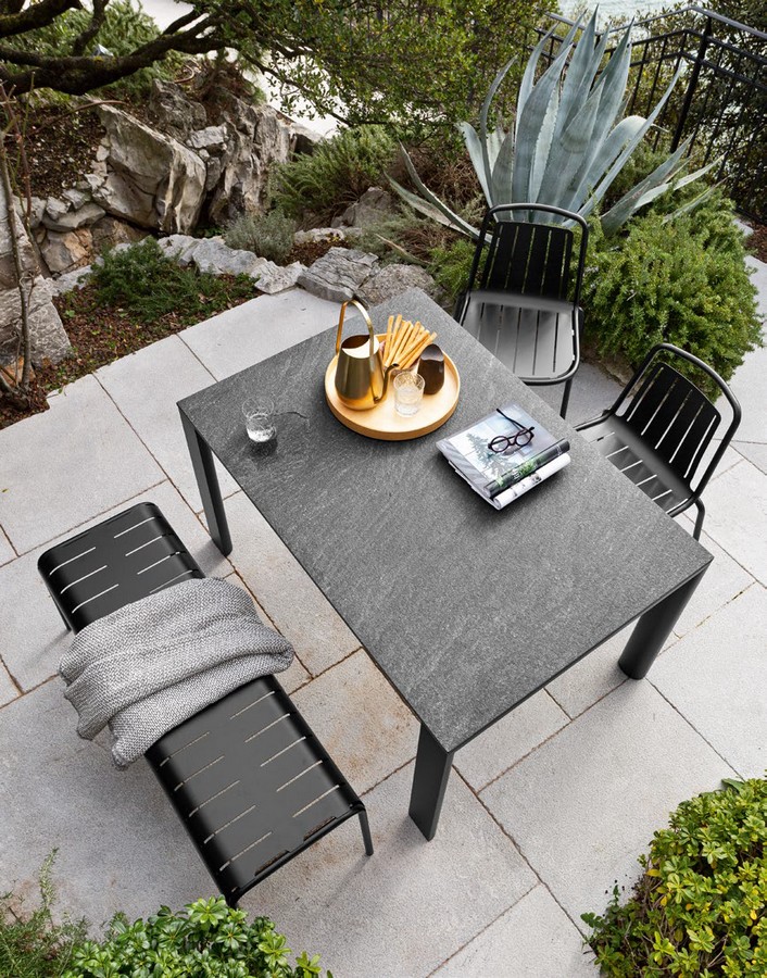 Table extensible Dorian de Connubia pour l'extérieur. Structure en métal peint disponible en plusieurs couleurs et plateau en céramique avec rallonge en stratifié HPL. Une table minimaliste et élégante, idéale pour un usage extérieur pratique.