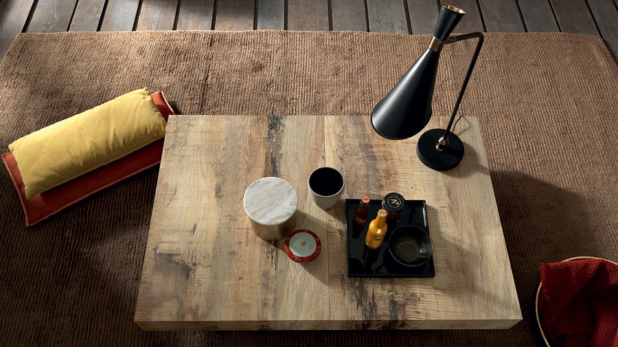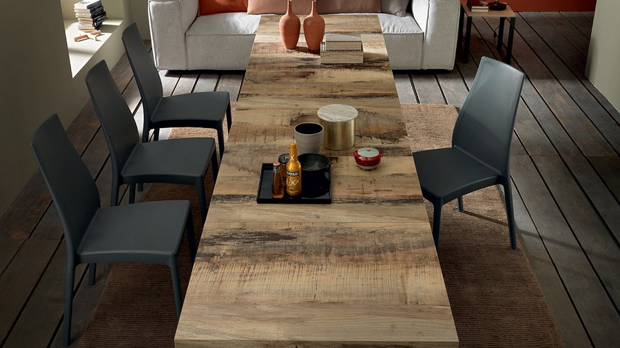 Table basse transformable en table à manger Assist par Altacom. Piètement en métal, mécanisme à gaz, hauteur réglable au millimètre près de 25 cm à 76 cm, plateau rectangulaire en mélaminé, laqué, effet bois ou mortier, deux rallonges intérieures et deux rallonges extérieures. Roulettes pliantes. Pieds de support rabattables.